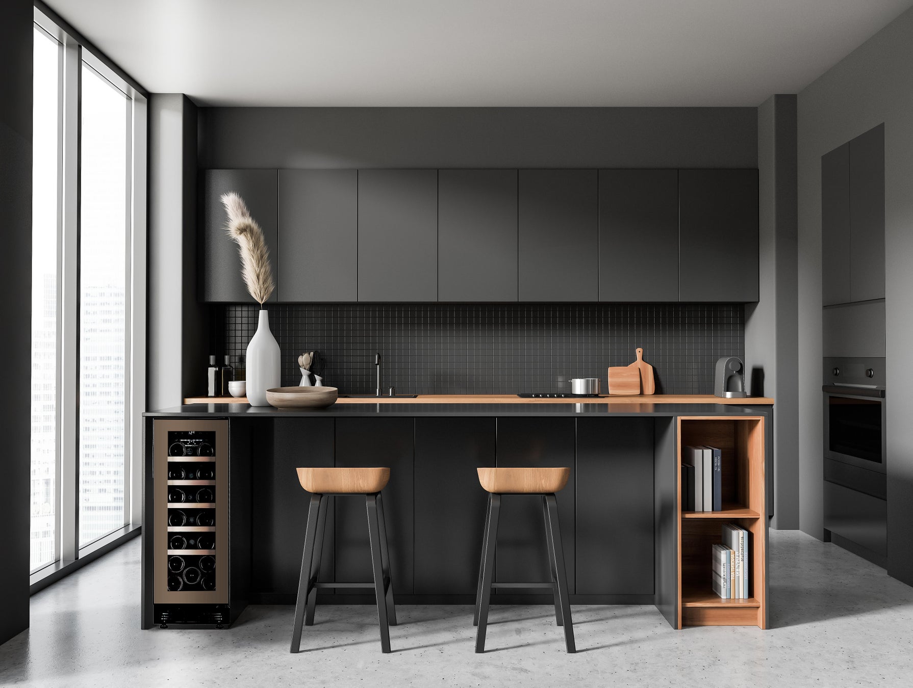 放熱を本体前面から行うことで、必要な放熱スペースを左右5mm、背面5mm、上部5mm(※)に抑えました。通常のワインセラーのように据え置きとしての使用はもちろん、カウンター下へビルトインとして設置することも可能です。