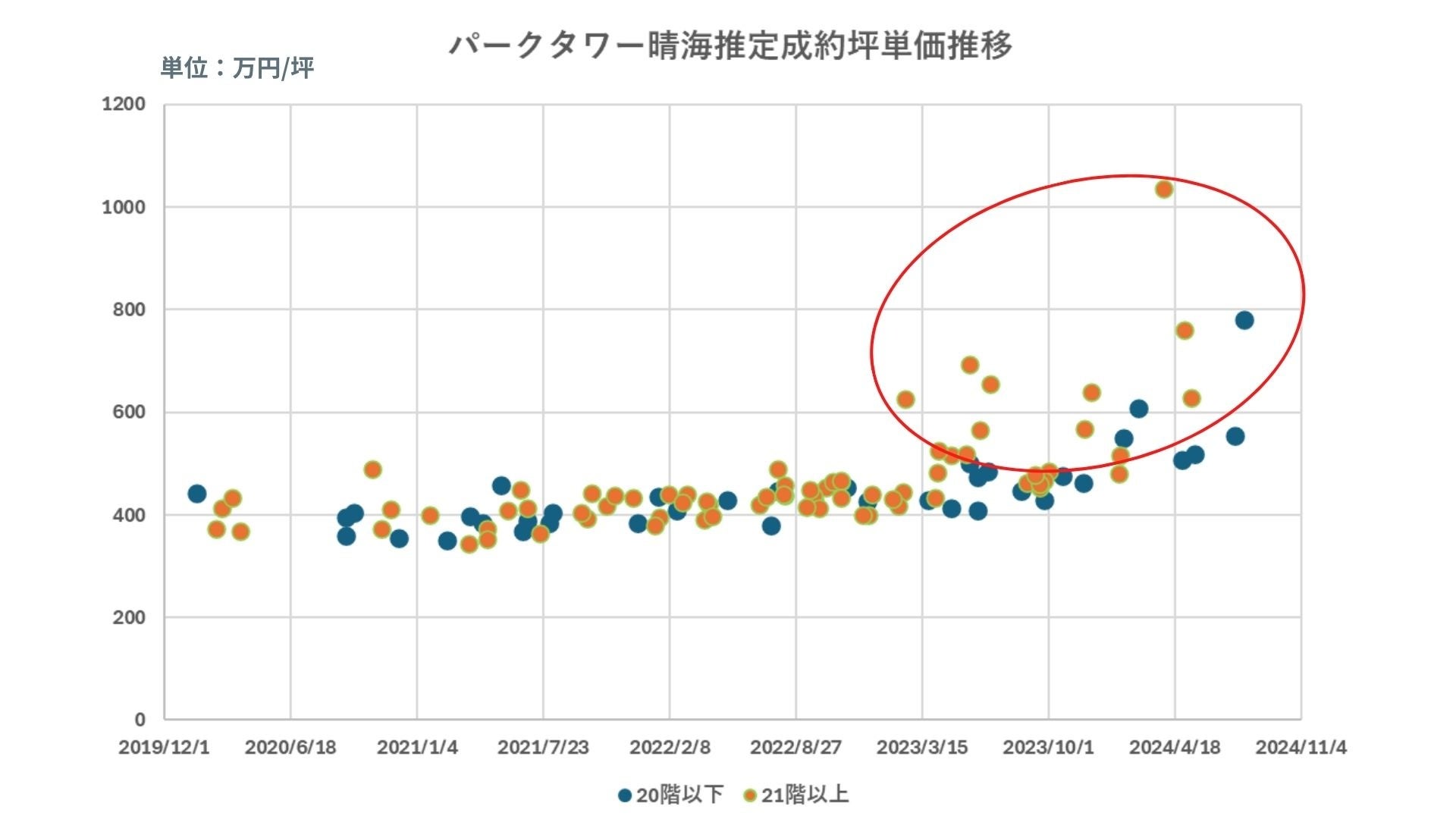上記のグラフはパークタワー晴海の推定成約坪単価を示しています。2019年以降徐々に坪単価が高騰してきましたが2023年からは、赤枠で示す通り坪単価が大きく上振れています。特に21階以上はその傾向が顕著にみられました。
