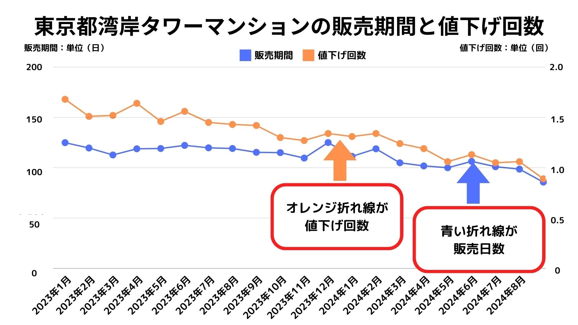 グラフ2: 東京都湾岸タワーマンションの販売期間と値下げ回数