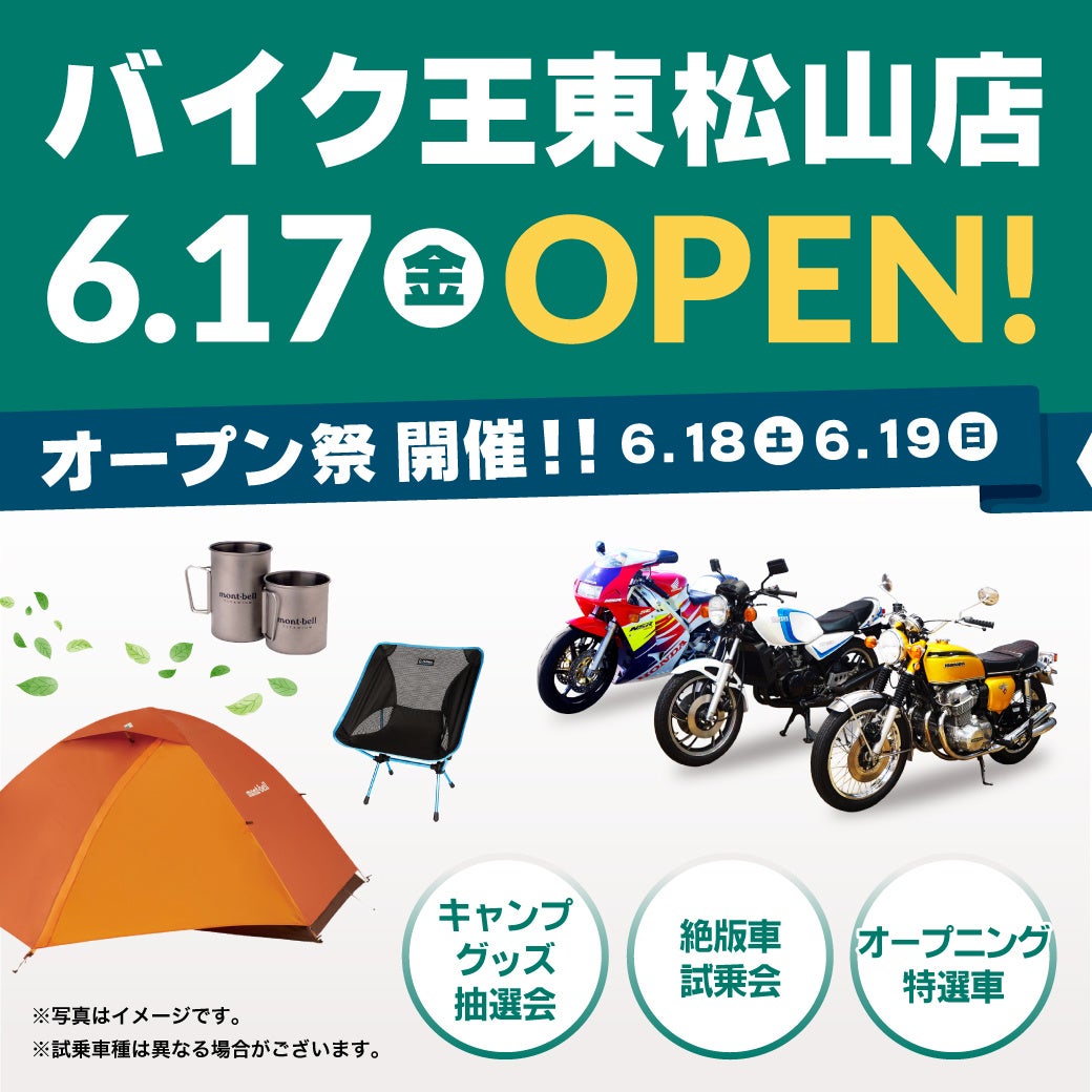 6月18日(土)と6月19日(日)の「バイク王 東松山店 オープン祭」は、キャンプグッズ抽選会と参加無料!絶版車試乗会を開催※1いたします。