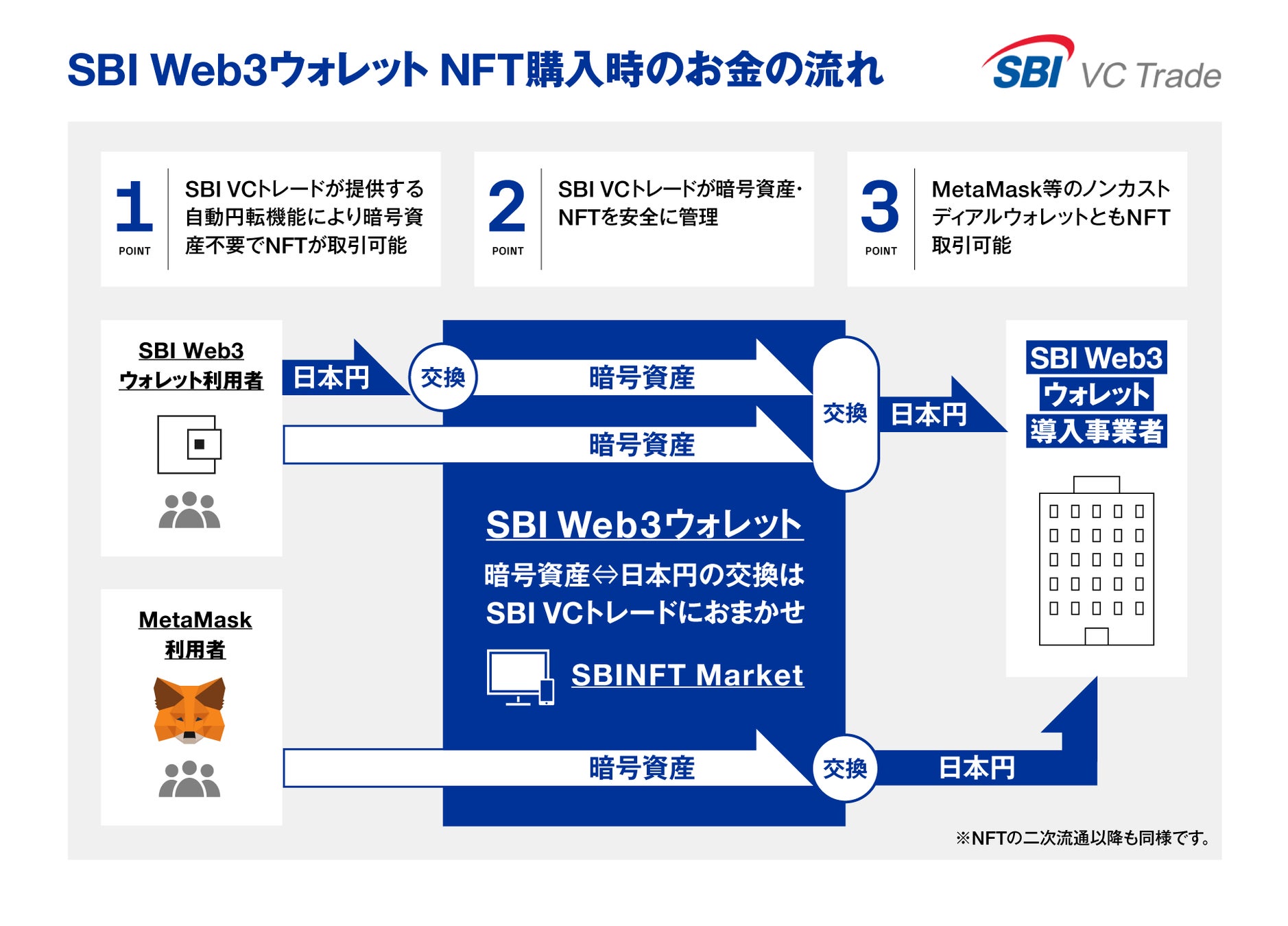 NFTコンサルティング事業及び、マーケットプレイス「SBINFT Market」を運営するSBINFT株式会社(東京都港区、代表取締役社長:高長徳、以下当社)は、SBI VCトレード株式会社(本社:東京都港区、代表取締役社長:尾崎 文紀、以下SBI VCトレード)と共同開発中の暗号資産・NFTの管理と売買が行える統合型ウォレットサービス『SBI Web3ウォレット』を2023年1月にリリースすることを発表します。
