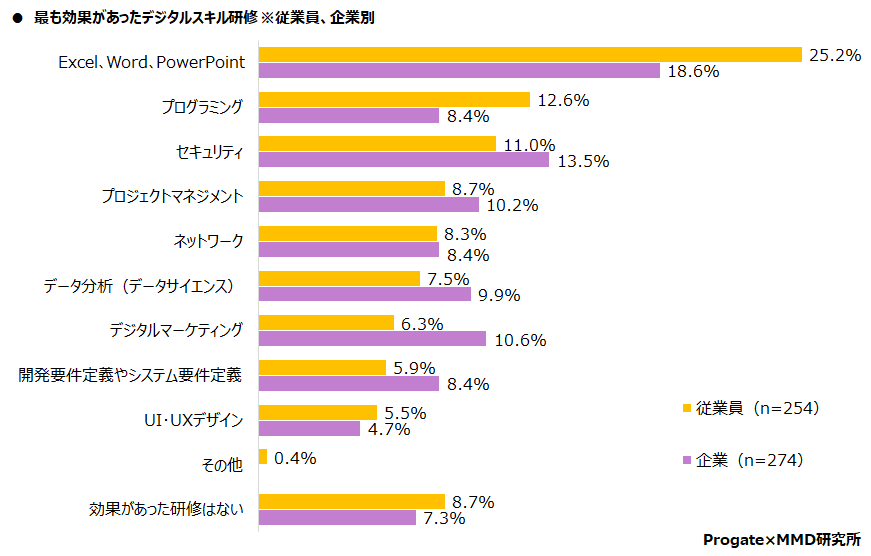 デジタルスキル研修、企業、従業員ともに9割以上が効果があったと実感。効果を実感したデシタルスキルは「Excel、Word、PowerPoint」「プログラミング」「セキュリティ」