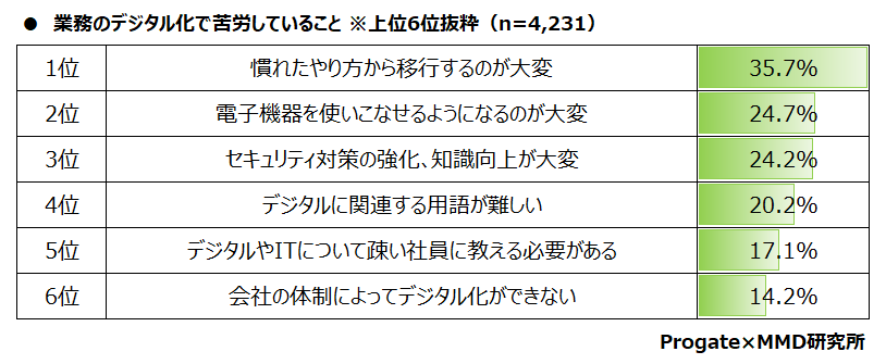 続いて、業務のデジタル化で苦労しているか聞いたところ、57.7%が苦労していると回答した。次に、業務のデジタル化で苦労している4,231人を対象に、業務のデジタル化で苦労していることを複数回答で聞いたところ、「慣れたやり方から移行するのが大変」が35.7%と最も多く、次に「電子機器を使いこなせるようになるのが大変」が 24.7%、「セキュリティ対策の強化、知識向上が大変」が24.2%となった。
