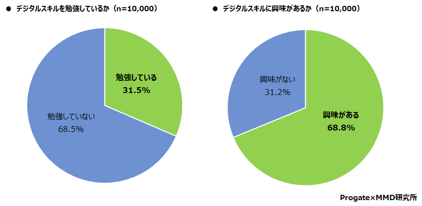 20歳~59歳の正社員の男女10,000人を対象に、デジタルスキルを勉強しているか聞いたところ、「勉強している」が 31.5%、「勉強していない」が68.5%となった。 続いて、デジタルスキルに興味があるか聞いたところ、68.8%が「興味がある」と回答した。