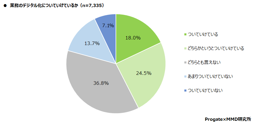 20歳~59歳の正社員の男女10,000人を対象に、勤めている企業で業務のデジタル化を行っているか聞いたところ、 73.3%が行っていると回答した。 次に、勤めている企業で業務のデジタル化を行っている7,335人を対象に、業務のデジタル化についていけているか聞いたところ、「ついていけている」が18.0%、「どちらかというとついていけている」が24.5%と合わせて42.5%が業務のデジタ ル化についていけているとなり、「あまりついていけていない」が13.7%、「ついていけていない」が7.1%と合わせて20.7% が業務のデジタル化についていけていないと回答した。