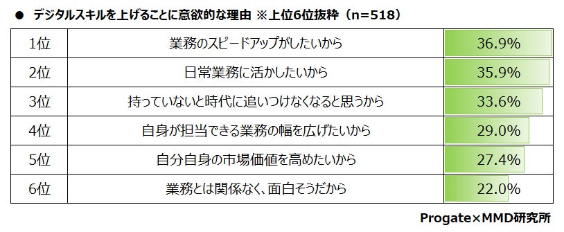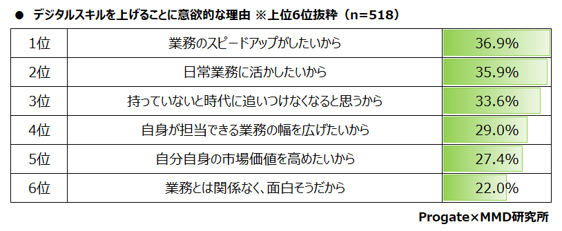 次に、自分のデジタルスキルを上げることに意欲的な518人を対象に、意欲的な理由があるか複数回答で聞いたところ、「業務のスピードアップがしたいから」が36.9%と最も多く、次に「日常業務に活かしたいから」が35.9%、「持っていないと 時代に追いつけなくなると思うから」が33.6%となった。
