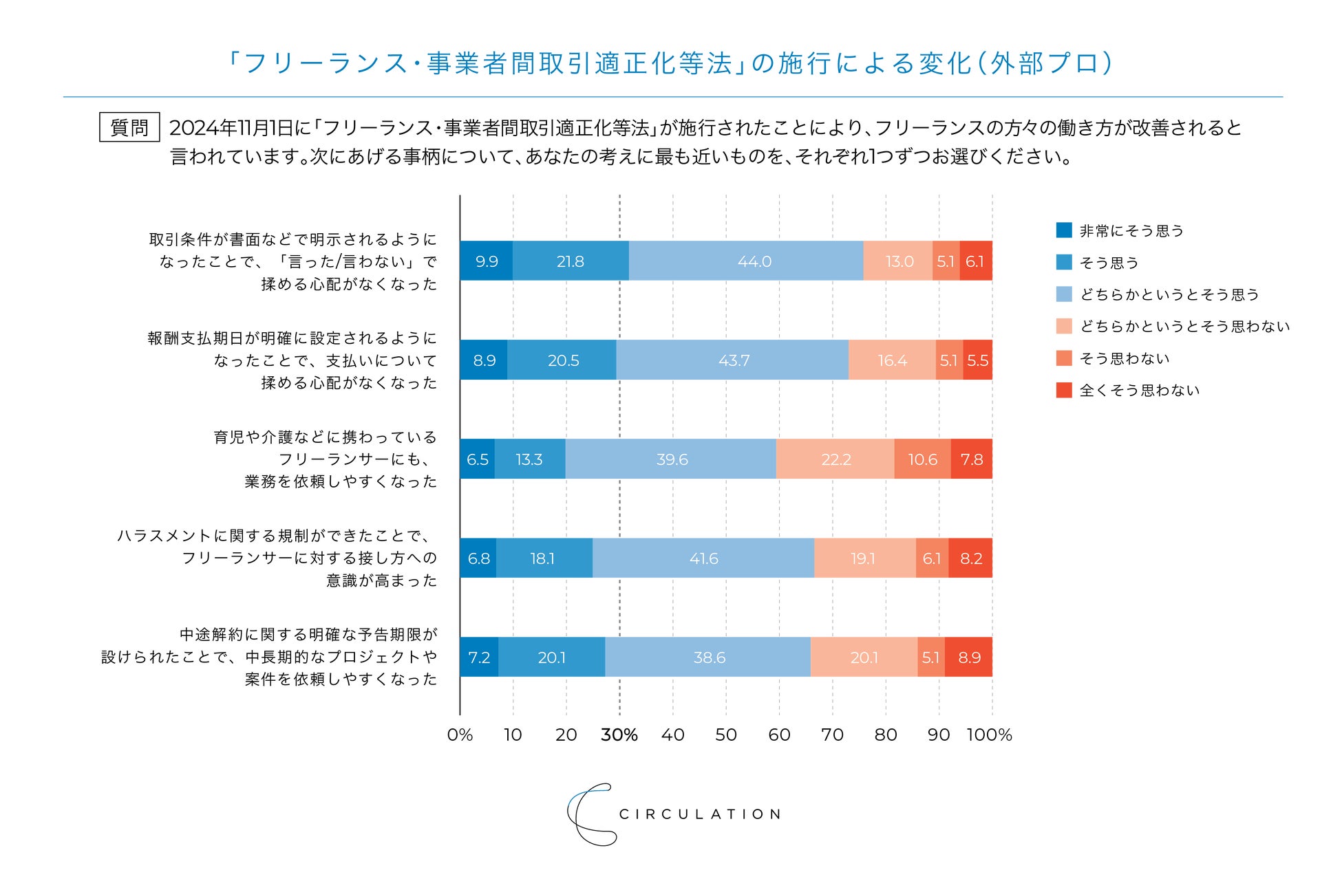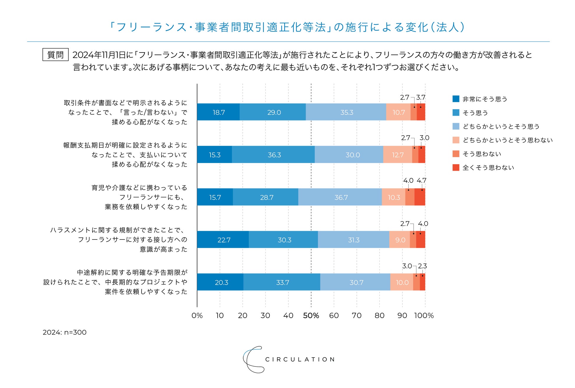 唯一、「非常にそう思う」「そう思う」が30%を超えたのは、「取引条件が書面などで明示されるようになったことで、「言った/言わない」で揉める心配がなくなった(31.7%)」のみという結果となりました。