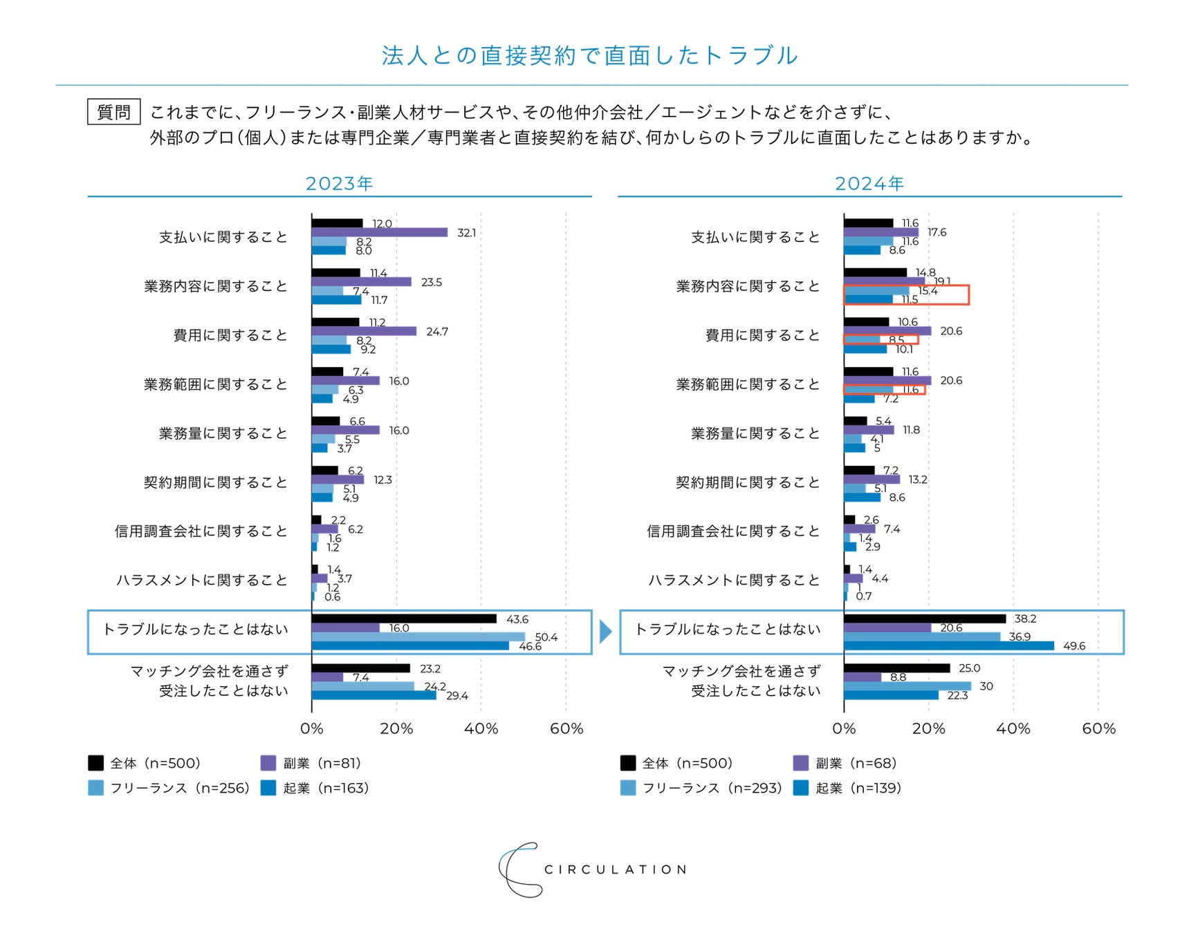 フリーランス・起業については、「業務内容に関すること(15.4%・11.5%)」で最も高く、特にフリーランスは8ポイント上昇しています。また、フリーランスについては、「トラブルになったことはない」の割合が、50.4%から36.9%まで大幅に減少しました。法人担当者の「直接契約に関して、トラブルになったことはない」の結果同様、直接契約でのトラブルが増えている可能性も考えられます。
