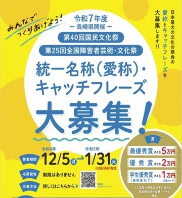 長崎県(本庁:長崎県長崎市、知事:大石賢吾)は、令和7(2025)年度に長崎県で開催される「第40回国民文化祭、第25回全国障害者芸術・文化祭(以下、文化祭)」の「統一名称(愛称)」「キャッチフレーズ」を募集します。