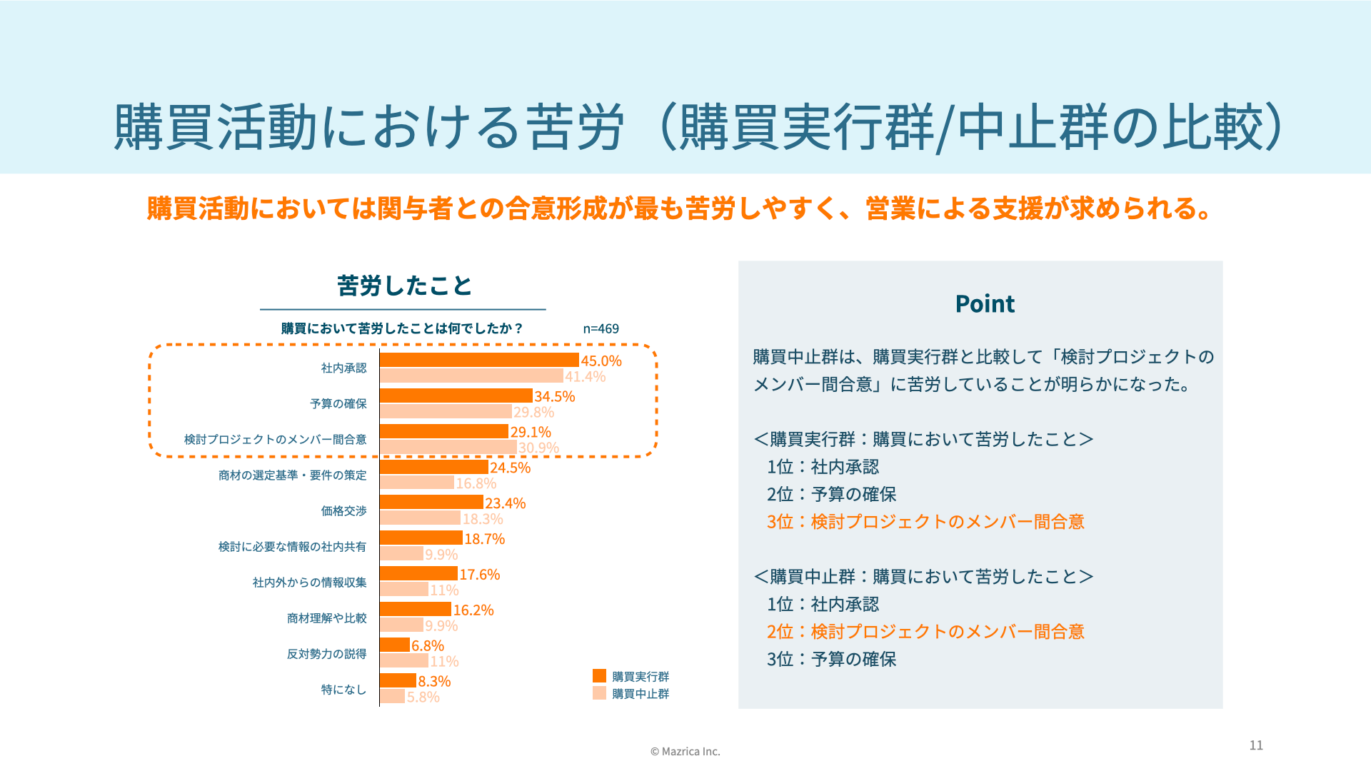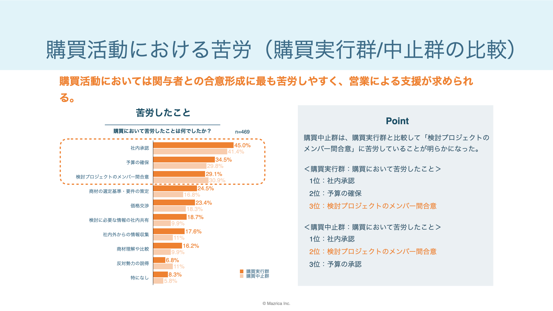 購買中止群は、購買実行群と比較して「検討プロジェクトのメンバー間合意」に苦労していることが明らかになった。