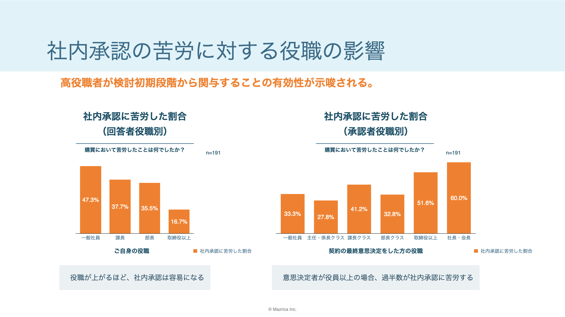 回答者の役職別では、役職が上がるほど社内承認は容易になる。意思決定者が役員以上の場合、過半数が社内承認に苦労する。