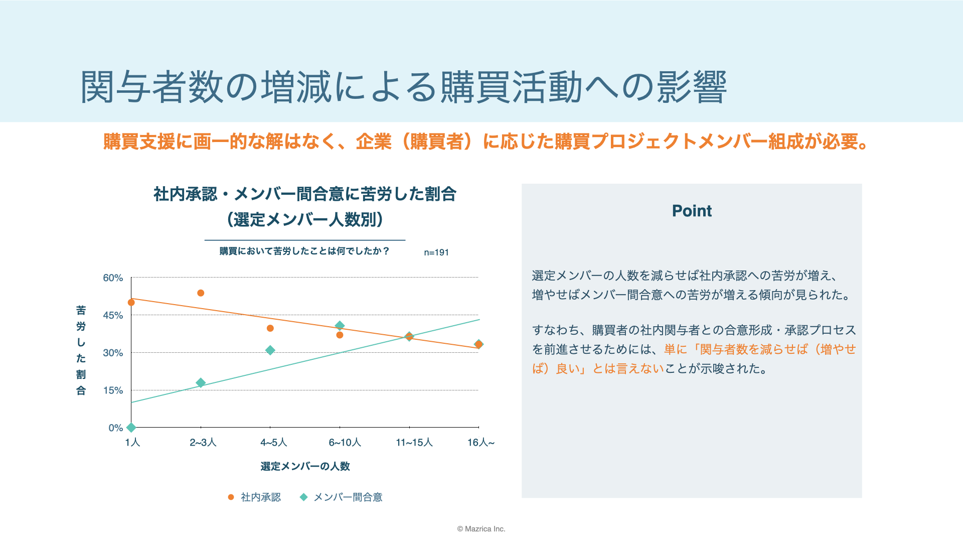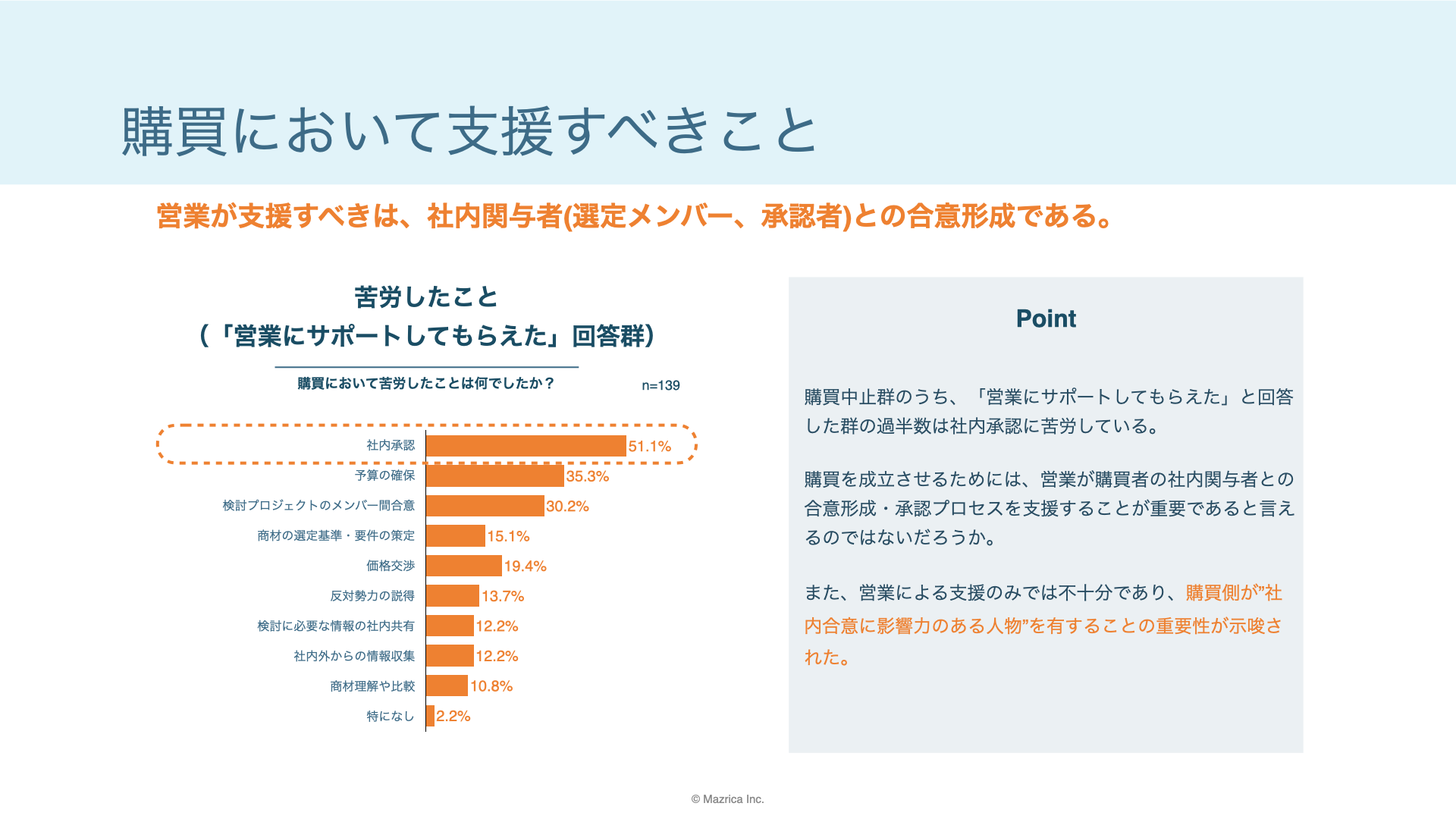 1.購買活動においては関与者との合意形成に最も苦労しやすく、営業による支援が求められる