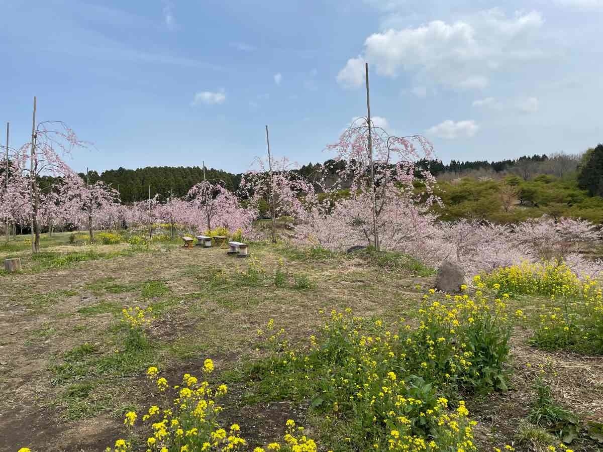 約1,300本のソメイヨシノが一斉に咲き乱れる大貞公園。大正初期に地域住民が数百本の桜の苗木を植えたことから始まりました。木の高さが低いことから桜の花々を間近に観察でき、公園内にはアスレチックや運動場もあることから、お子様と一緒に楽しめます。
