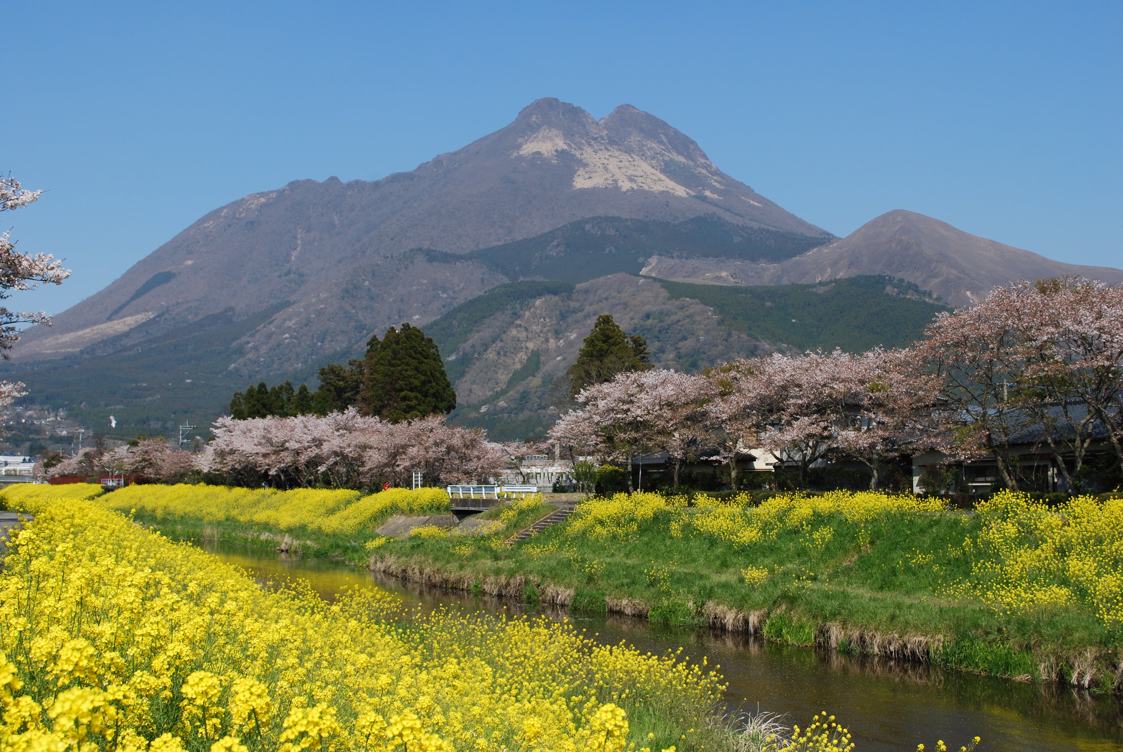 JR由布院駅から大分川沿いへ5分ほど歩くと見えてくる桜並木。標高約1,583mの由布岳をバックに桜と菜の花で彩られるコントラストは美景。春爛漫の由布院の自然を満喫しながら散策を楽しめます。のどかな里山の風景を楽しむには、観光辻馬車の利用もおすすめ。