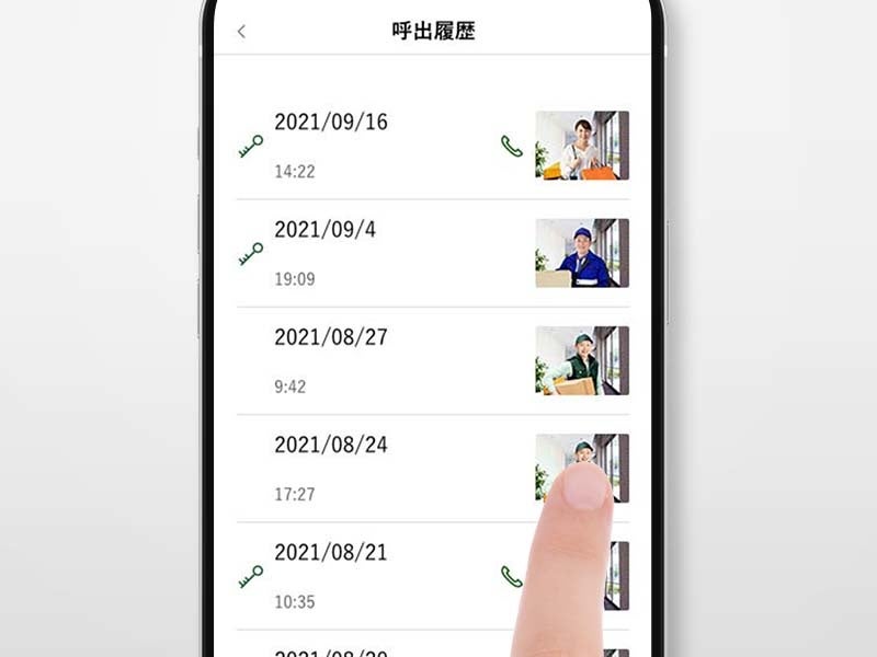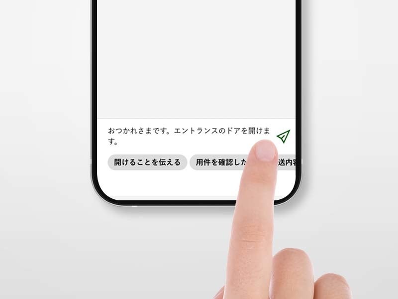 外出先・オフィス・コワーキングスペースなど、好きな場所からお手元のスマートフォンでインターホンの映像を見ながら来訪者対応、エントランスの解錠が可能です。音声通話に加え、メッセージの送信ができるため、オフィスや電車の中などの声を出せない環境でも問題ありません。また、リモートワークやWeb会議中でもスマートフォンから対応可能です。呼出を受けられない場合でも、履歴から来訪者の写真を確認できます。