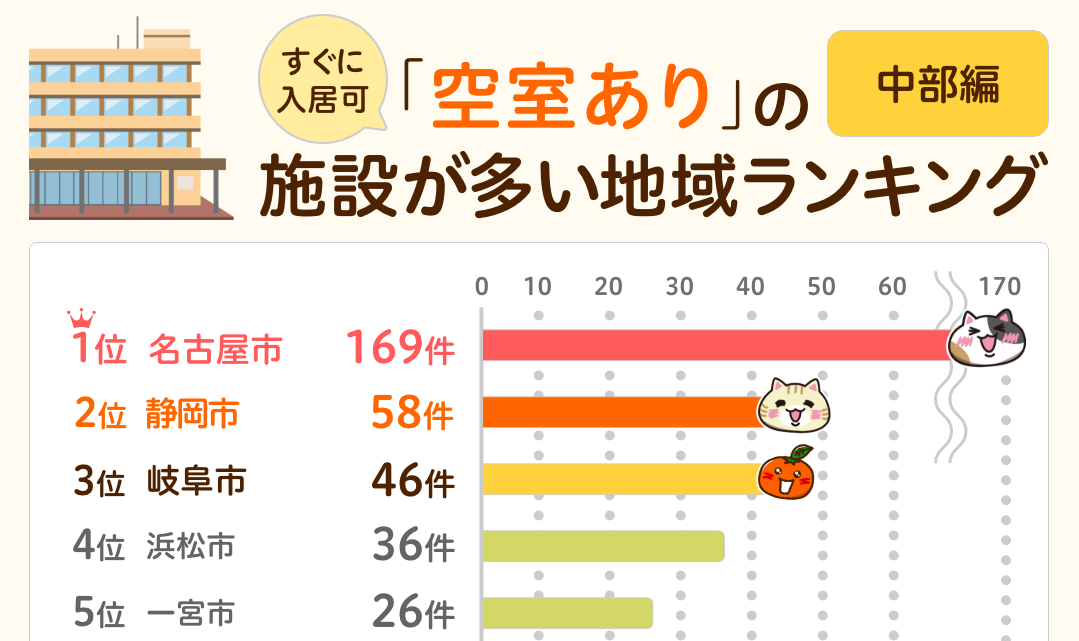 そこで今回は、首都圏・近畿圏に続き、愛知県や静岡県が属する中部圏に所在する「空室あり」の老人ホームが多い地域をランキング形式にまとめました。