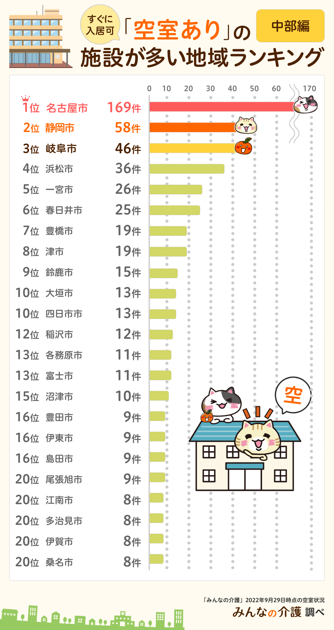 1位は名古屋市で169件。次いで2位は58件で静岡市、3位は岐阜市で46件でした。