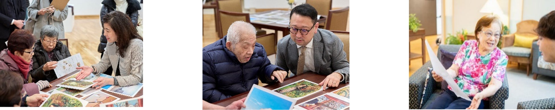 ●対話型鑑賞 :ご入居者様がアート作品を鑑賞し、普段ホームで関わっている介護職員ではないファシリテーターの問いかけによって感じたことや考えたことを、自由にお話していただく対話型鑑賞。普段知りえないご入居者様の感性や価値観が引き出され、介護職員がその方の心を揺り動かしていることや心のありかを知っていくことで、その方のありたい姿・状態に近づく手掛かりとなることを目指しています。