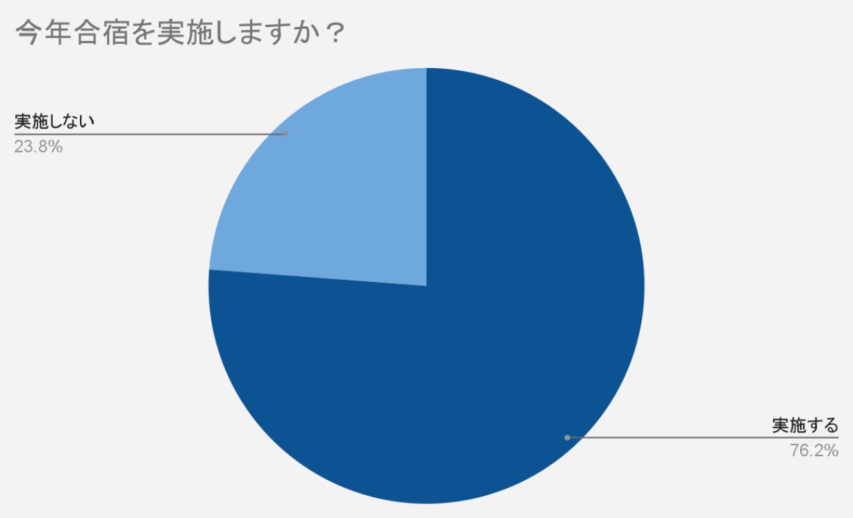 今年、「合宿を実施する」という回答は、8割に迫った。年代別(小学生、中学生・高校生、大学生・社会人)においても「合宿を実施するチーム」の割合は「合宿を実施しないチーム」の割合よりも高く、特に小学生年代においては「合宿を実施する」と回答した割合は9割近くにおよんだ。