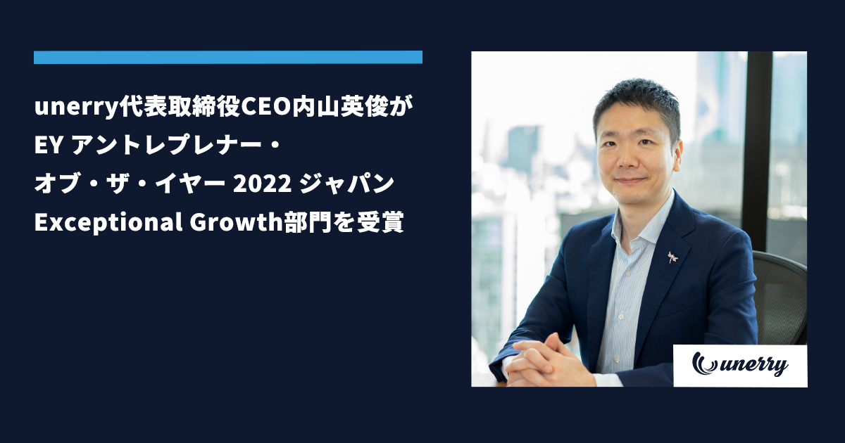 リアル行動データプラットフォーム「Beacon Bank」を運営する株式会社unerry(東京都港区、以下unerry)の代表取締役社長CEO 内山 英俊は、EY Japanが主催する起業家表彰制度「EY アントレプレナー・オブ・ザ・イヤー 2022 ジャパン」(以下、EOY 2022 Japan)にて「Exceptional Growth部門」を受賞いたしました。また、2022年度の日本代表候補のアントレプレナーとして最終選考に臨みます。選考結果は本年12月上旬に発表予定であり、日本代表は2023年6月の世界大会に参加します。