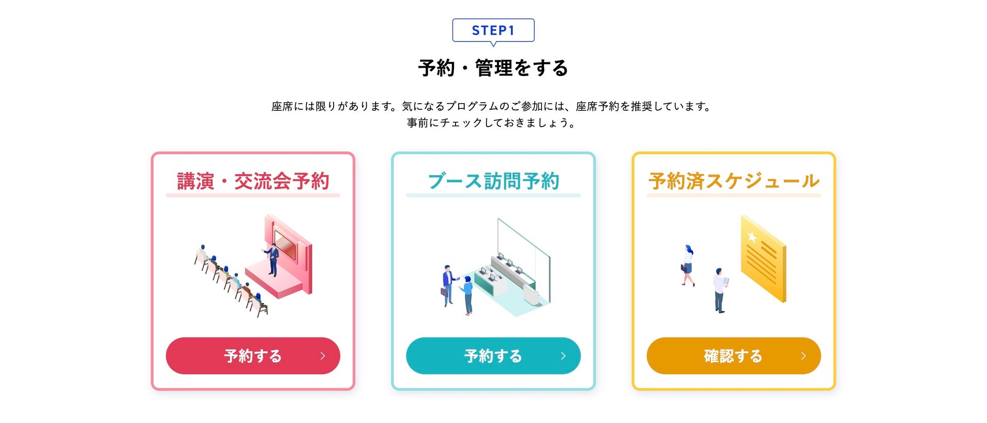 特設サイトへの登録後、専用マイページ「来場ガイドブック」にアクセスし以下の手順で訪問予約をお願いいたします(なお、事前の訪問予約なしでも、当日ブースにお越しいただければご案内可能です)。