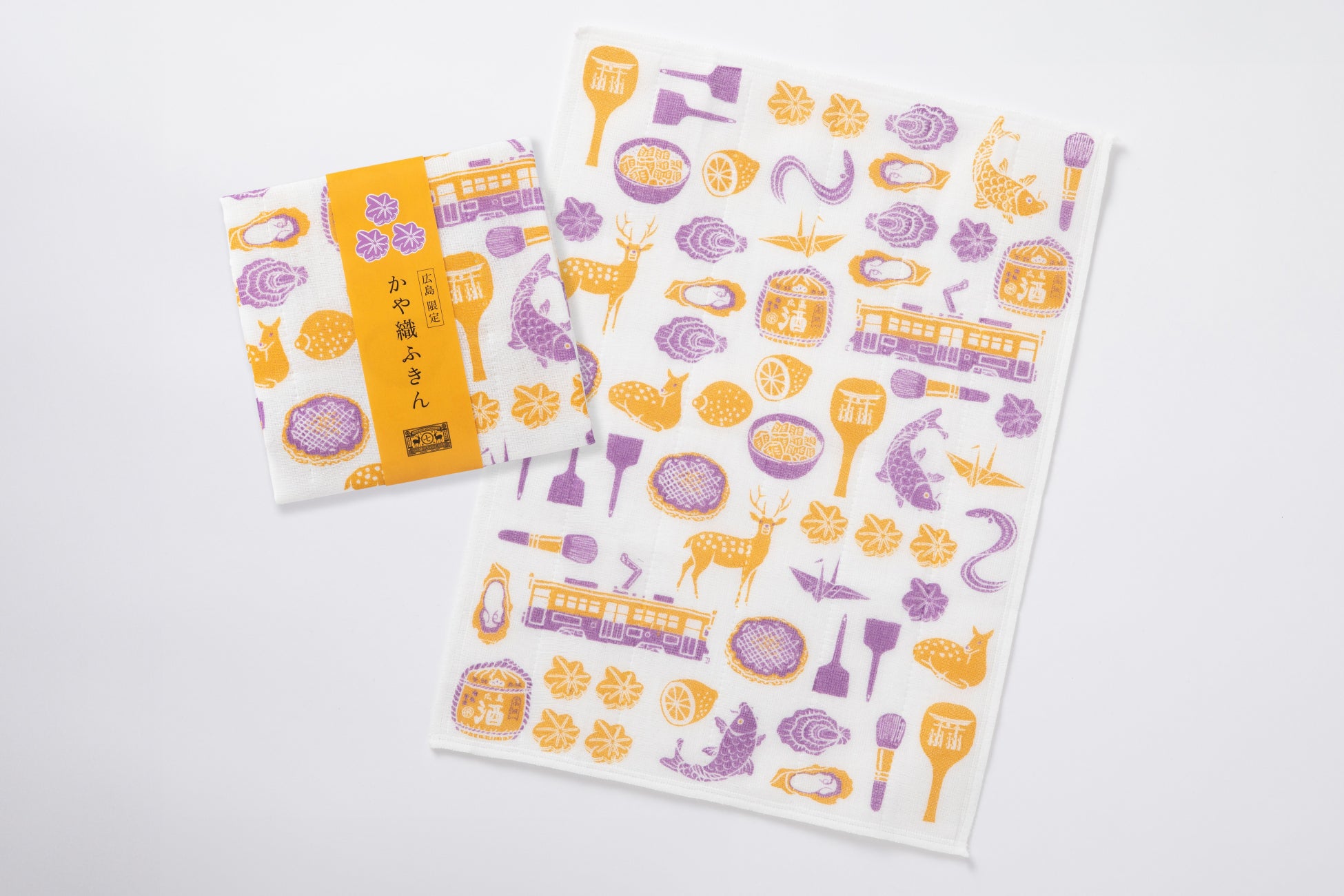 また広島県内限定の特別アイテムとして「かや織ふきん 広島」をご用意。もみじ饅頭やお好み焼きなど、広島の風土や文化をモチーフにデザインしたふきんは、お土産・贈り物にも最適です。