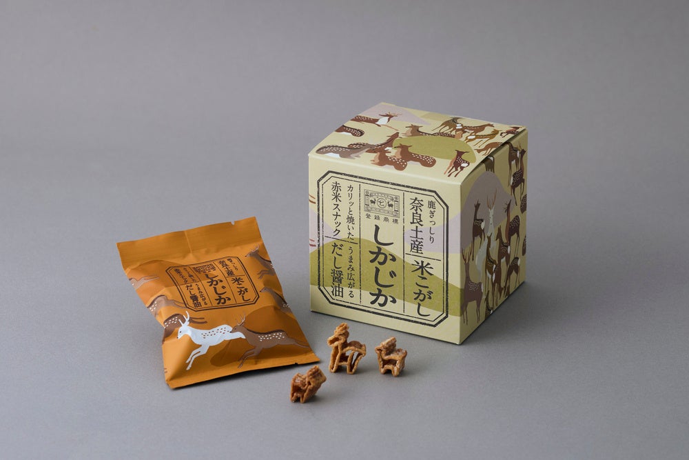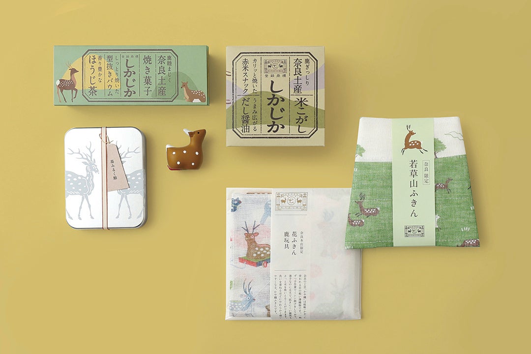 しかじか米こがし だし醤油、しかじか型抜きバウム ほうじ茶、飴缶 苺みるく、花ふきんご当地 鹿玩具、奈良みくじ 鹿、若草山ふきん