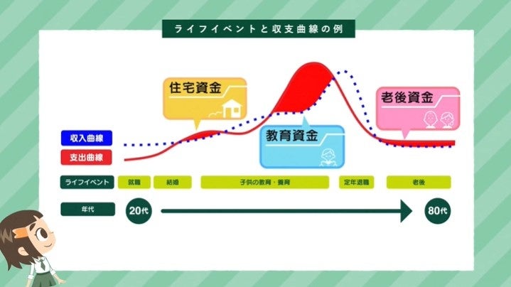人生を通して必要となる費用はライフステージごとに異なることを理解し、生涯収支について学びます。可処分所得や非消費支出の分析など具体的な事例を通して、家計の構造を理解した上で、収入と支出のバランスの重要性と、リスク管理も踏まえた家計管理の基本について説明いたします。