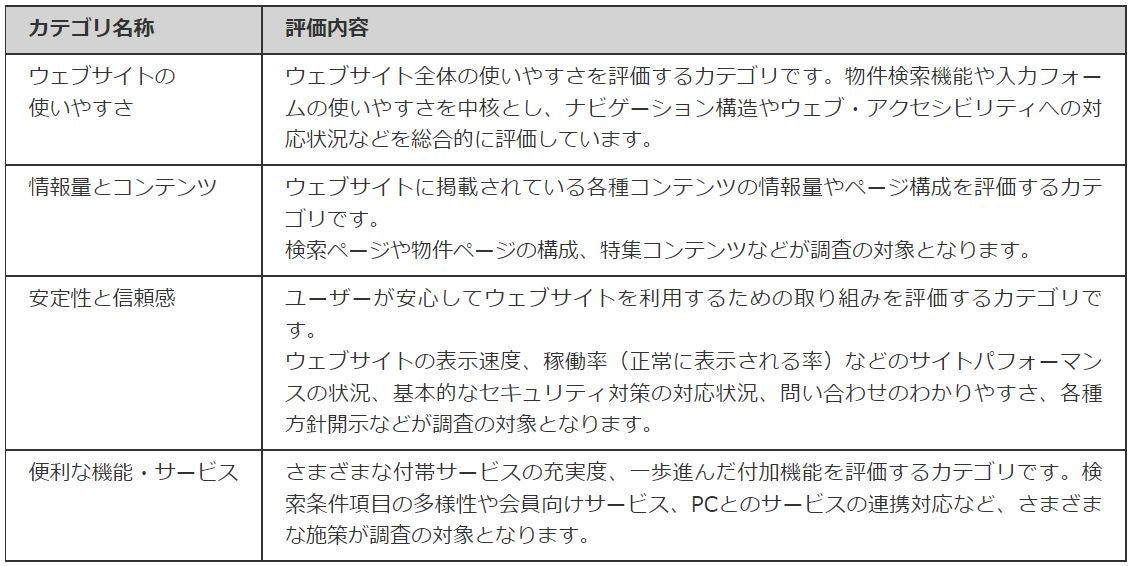 当ランキングでは、「サイトの使いやすさ」「情報量とコンテンツ」「安定性と信頼感」「便利な機能・サービス」の4つの視点(カテゴリ)から構成される210の調査項目により当社アナリストが評価を行い、総合的に優れた賃貸不動産情報サイトのランキングを決定しました。