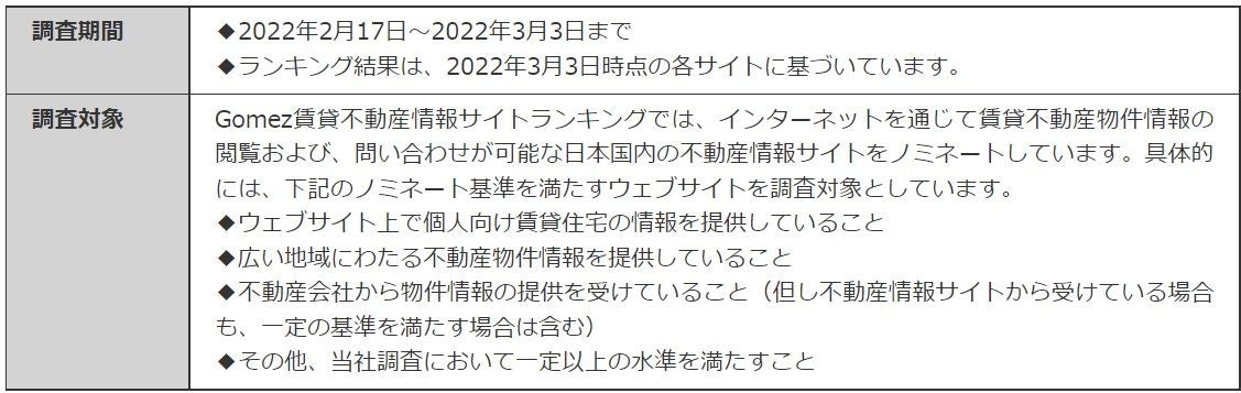 2022年1月31日発表済の「Gomez賃貸不動産情報スマホサイトランキング」では対象をスマートフォンサイトとしていましたが、当ランキングではパソコンおよびタブレット端末からの利用を前提としています。