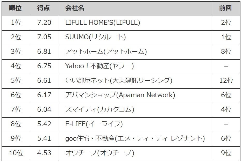「Gomez賃貸不動産情報サイトランキング」の結果は、以下のとおりです。
