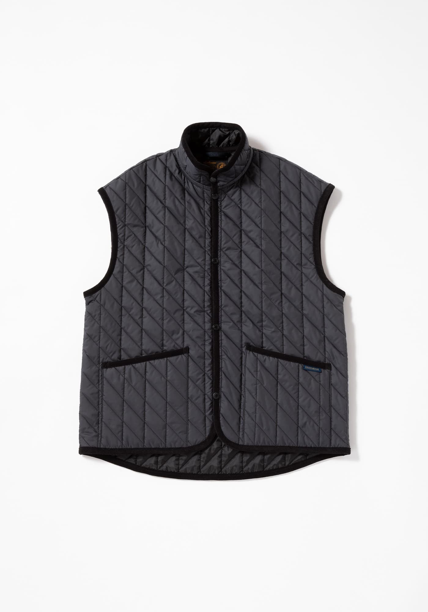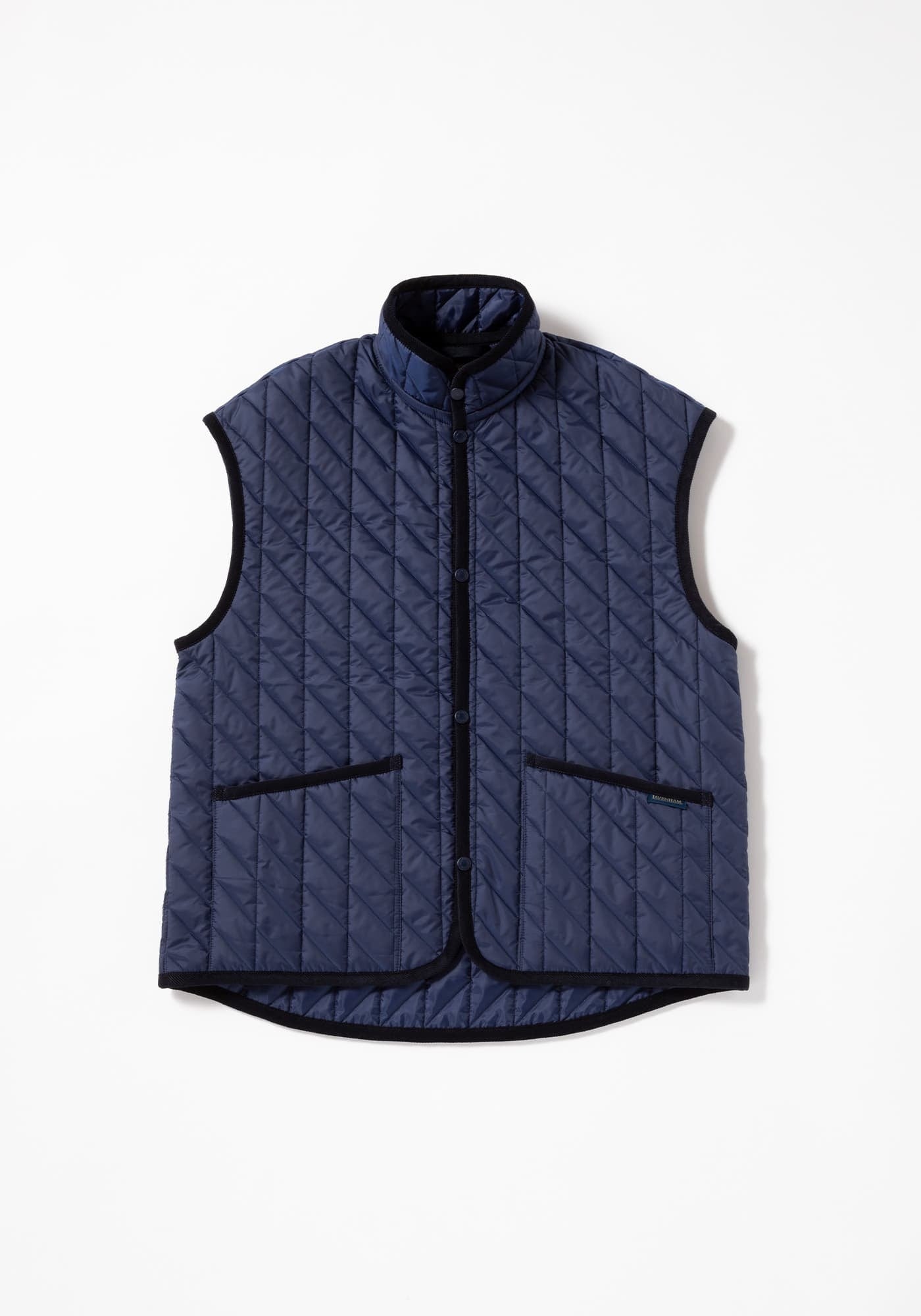 LAVENHAMの襟付きジレ「ミックフィールド」をベースに、1900年代初頭のBASEBALLユニフォーム補強パーツとして使われていたストライプと斜めで形成したJackmanオリジナルキルトパターンを採用し、野球の投手が登板後に着用するアイシングポンチョ型のシルエットにアレンジ。