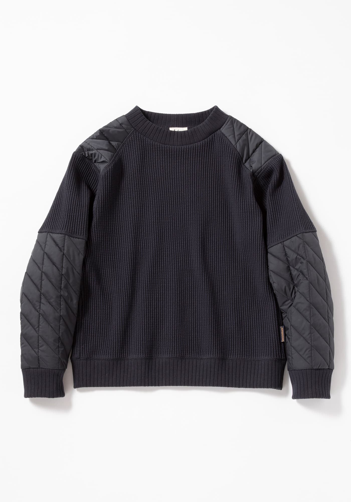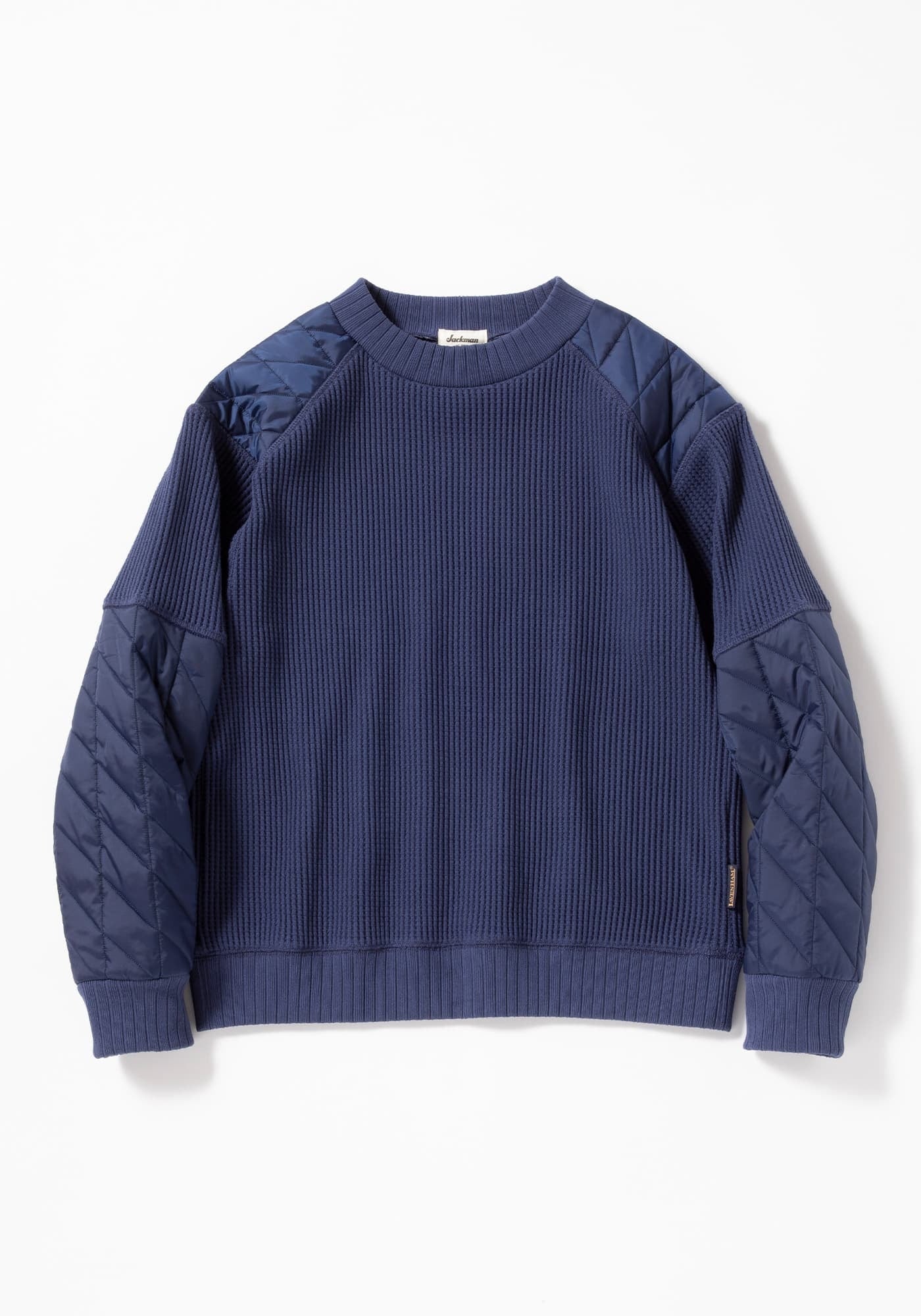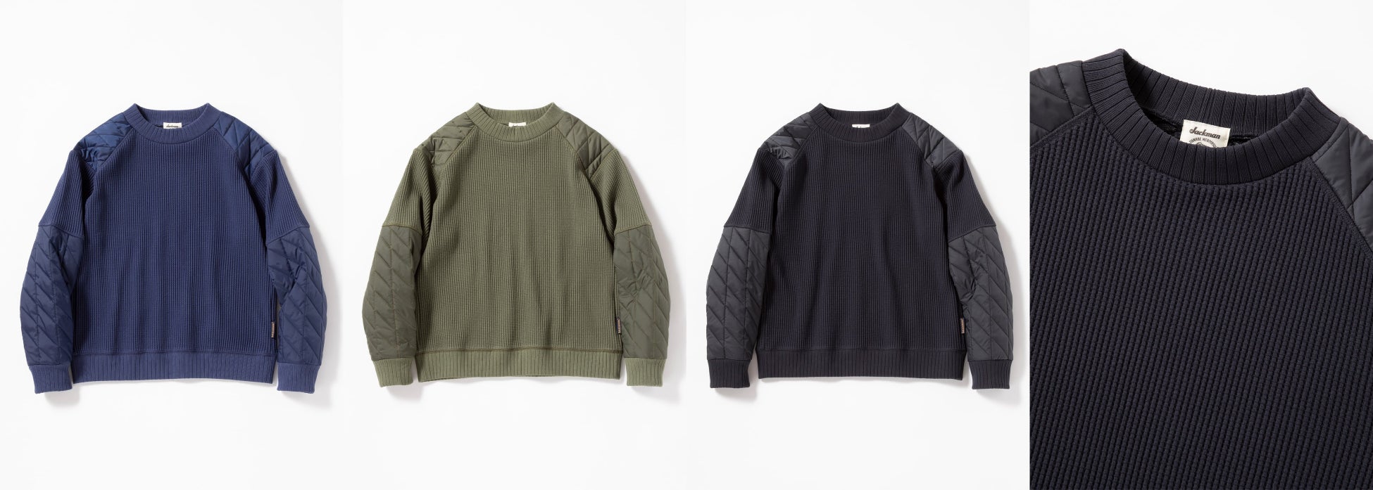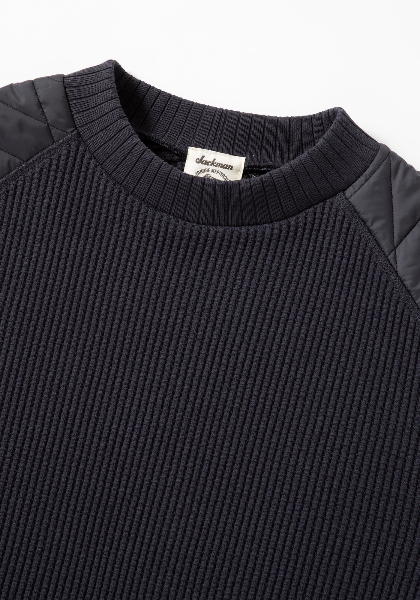 Jackmanを代表する、極太のラフィ綿糸を旧式ジャカード機で編み立てた、ビッグワッフルのコットン生地を使用したボディのショルダーとスリーブ部分に、スラント(斜め)ダイヤモンドでキルティングした、リサイクルポリエステルのラブンスター素材をミックス。