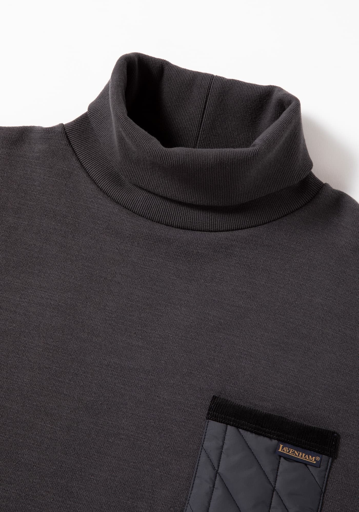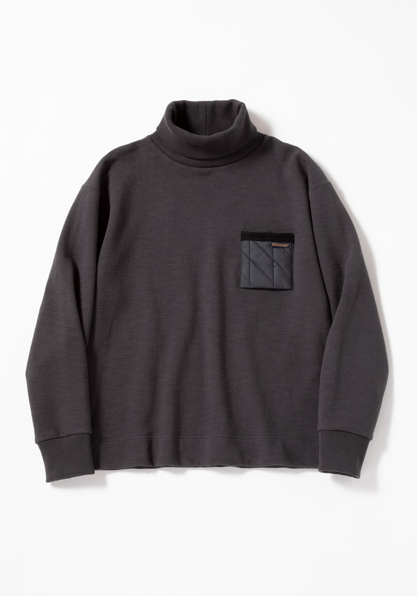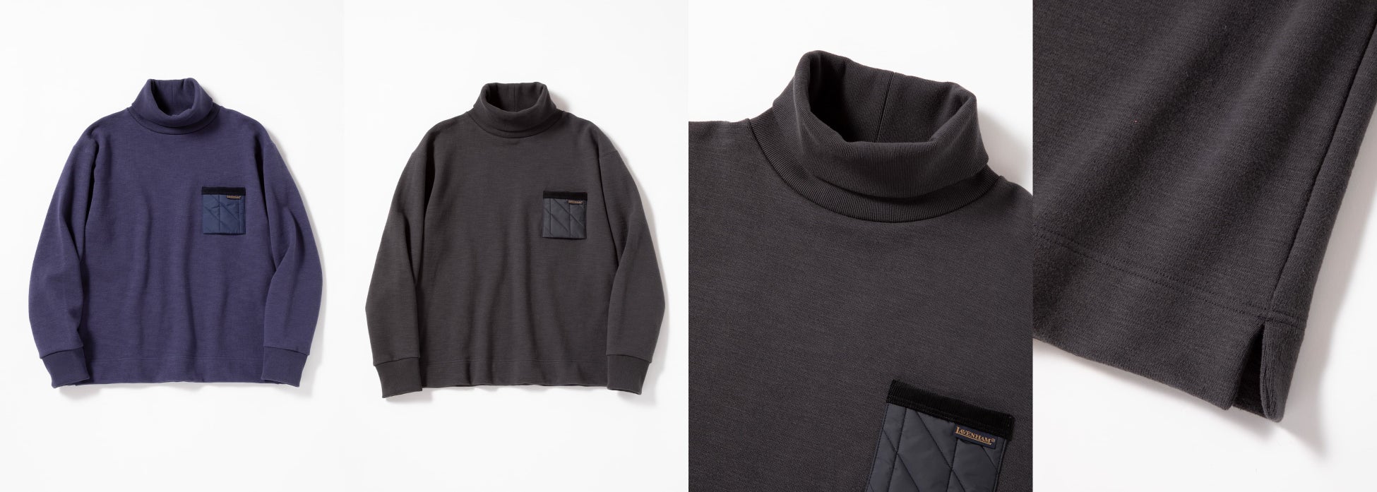 太い番手の国産糸を使用し日本国内で編み立てた、JackmanのGG(ガラガラ)裏毛素材のスウエットハイネックシャツに、スラント(斜め)・ダイヤモンドのキルティングポケットをオン。1920年頃のBaseball試合前の防寒着を参考に、コットン100%の快適なリブや裄丈を長めにデザイン。