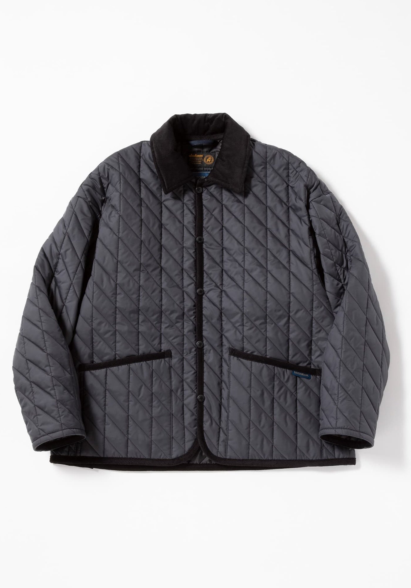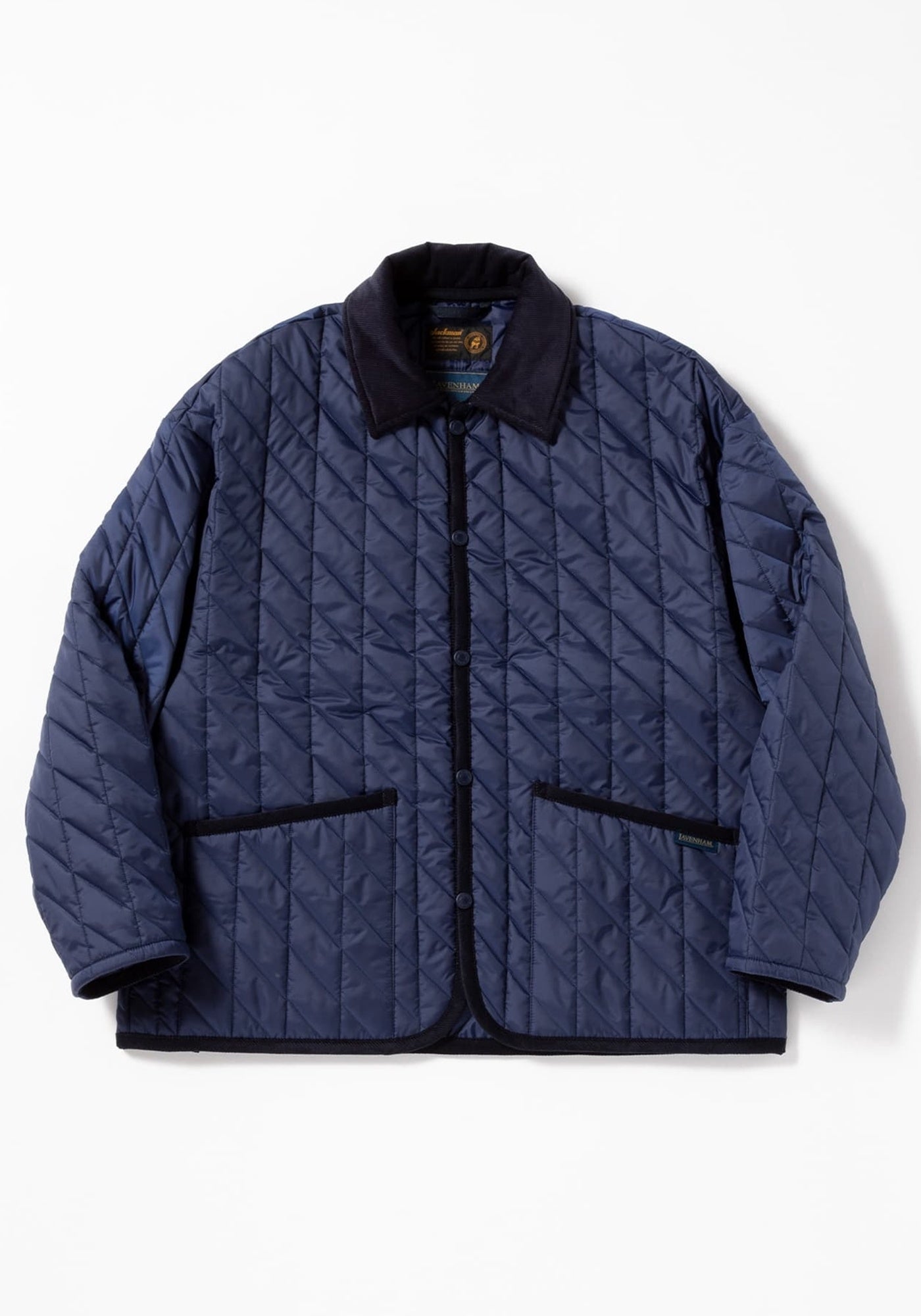 LAVENHAMを代表するクラシカルなアウター「レイドン」を、Jackmanのブランドルーツである、野球の投手が登板後に着用するアイシングポンチョのデザインが融合した、コラボレーション初のジャケットが誕生。ジレ同様にストライプと斜めで形成したJackmanオリジナルキルトパターンを採用。