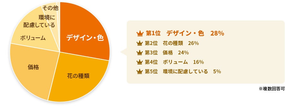 「デザイン・色」が最も多い結果となりました。続いて「花の種類」「価格」となりました。母の日の花といえばカーネーションというイメージが定着していますが、花の種類よりもデザインや色を重視する傾向となりました。
