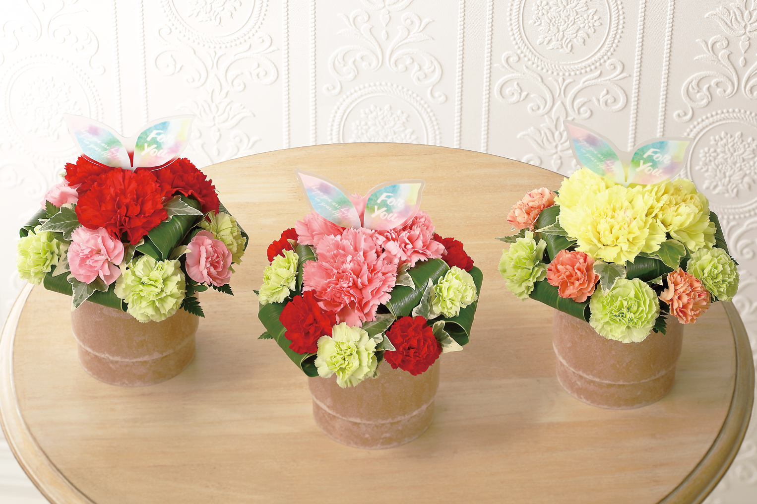 そんな花キューピットの70周年を記念して、母の日に「地球にやさしいフラワーギフト」として「ウッドポットシリーズ」が誕生しました。植物由来の原料でできている、環境に配慮した花器に色とりどりのカーネーションをアレンジしています。お母さんがもらって嬉しいだけではなく、地球にもやさしいフラワーギフトが実現しました。