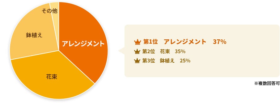 「アレンジメント」が最も多く、37%という結果になりました。アレンジメントとは、花器と呼ばれるバスケットなどの容器に吸水性スポンジを入れ、そこに花を生けたスタイル(形)です。花瓶に生け直す必要がないため、受け取ったまま自宅で飾ることができます。簡単に飾れて手入れがしやすいため、気軽に贈れる花ギフトです。