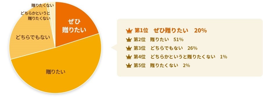 「ぜひ贈りたい」「贈りたい」を合わせて71%が、環境に配慮されたプレゼントを贈りたいと回答しました。サスティナブルやSDGsという言葉が一般化してきた近年では、母の日のプレゼントも地球環境に配慮されたものを選びたいと思う方が多いようです。