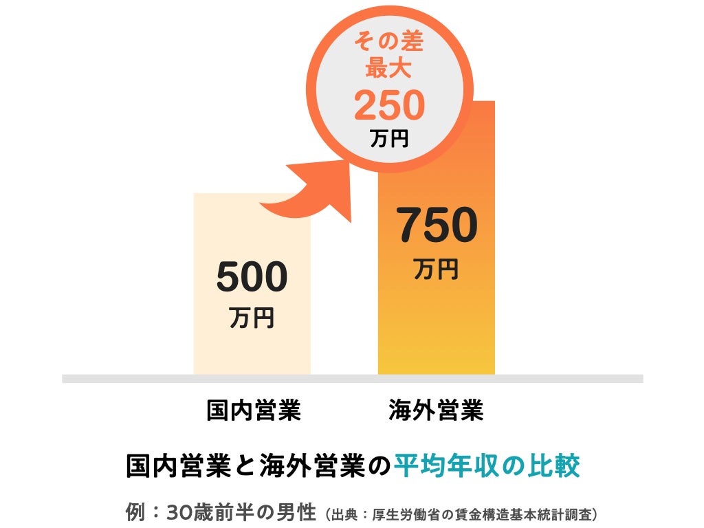 国内業務と海外業務では、年収に大きな差があることをご存知でしょうか?国内営業の平均年収が500万円に対して、海外営業の平均年収は750万円と、その差最大250万円にもなります。