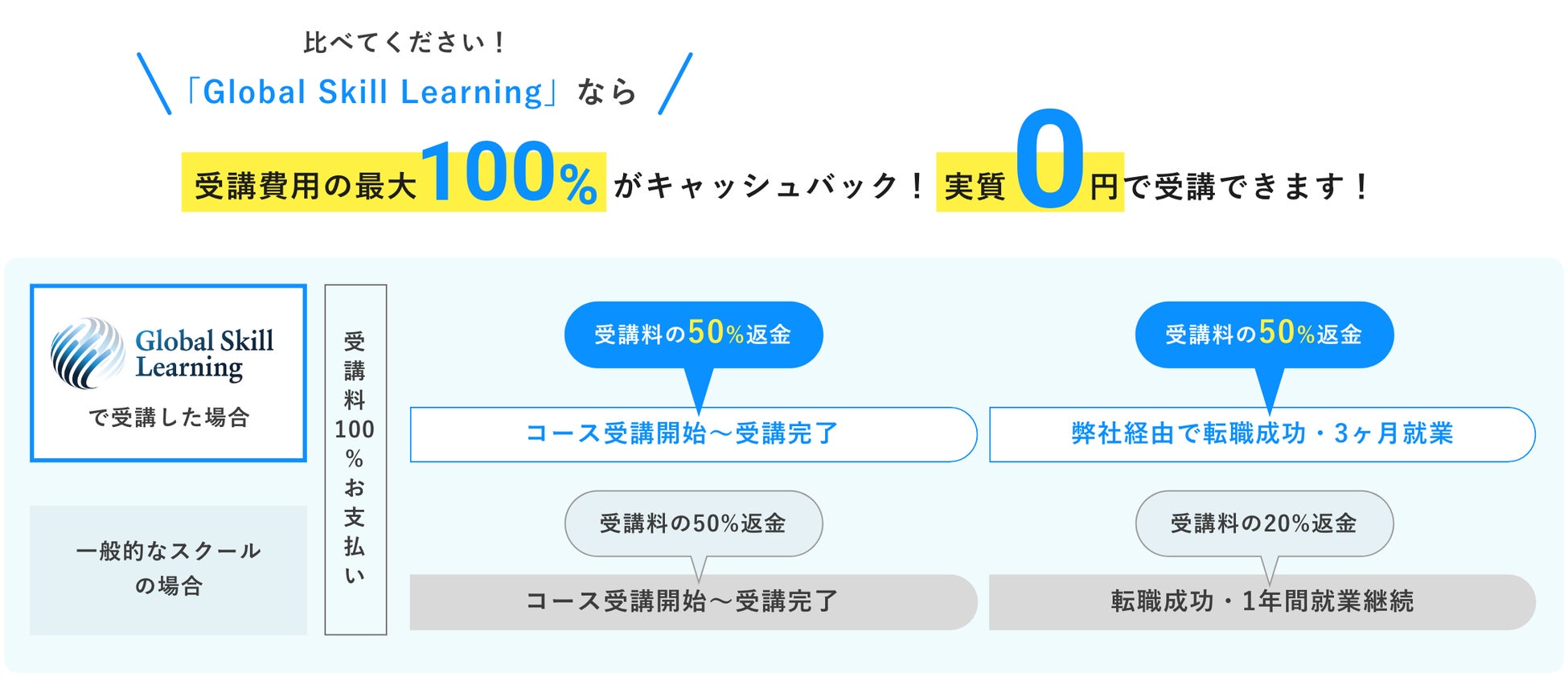 経済産業省のリスキリング支援プログラム採択により、受講料の最大100%キャッシュバックが可能となりました。これにより、受講者は経済的な負担を気にせず学びに集中でき、キャリアのステップアップを安心して目指せます。