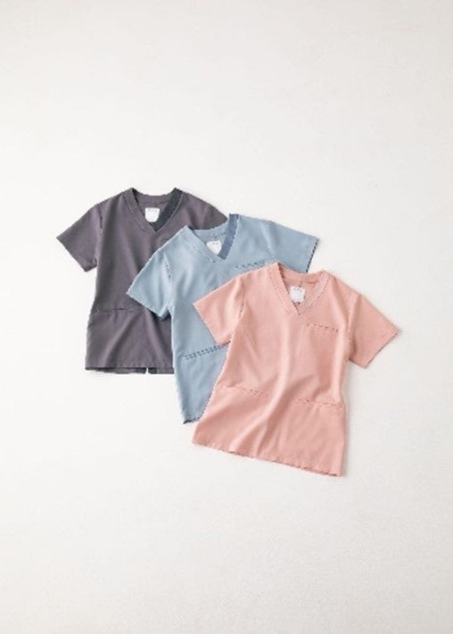 男女兼用で着用できる、ニュートラルなデザインのスクラブ。