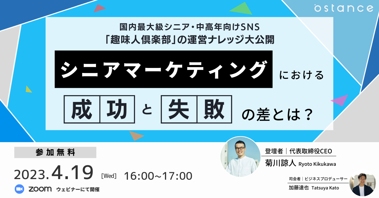 株式会社オースタンス(本社:東京都渋谷区/代表取締役社長:菊川諒人)は国内最大級のシニア向けSNS『趣味人倶楽部』(しゅみーとくらぶ)を運営するとともに、中高年層向けに事業を展開される数多くの企業様へ幅広いソリューションを提供する企業です。