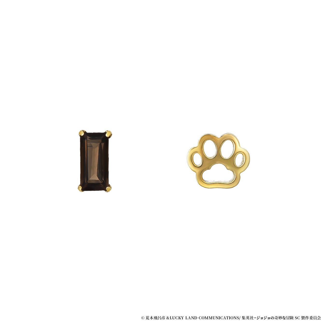 スモーキークォーツでザ・フールが自在に操る砂のカラーをイメージ。ブラウンカラーも相まって長方形のフォルムがイギーの好物であるコーヒーガムを思わせます。かわいらしいイギーの肉球をデザインした地金のピアスとセットです。