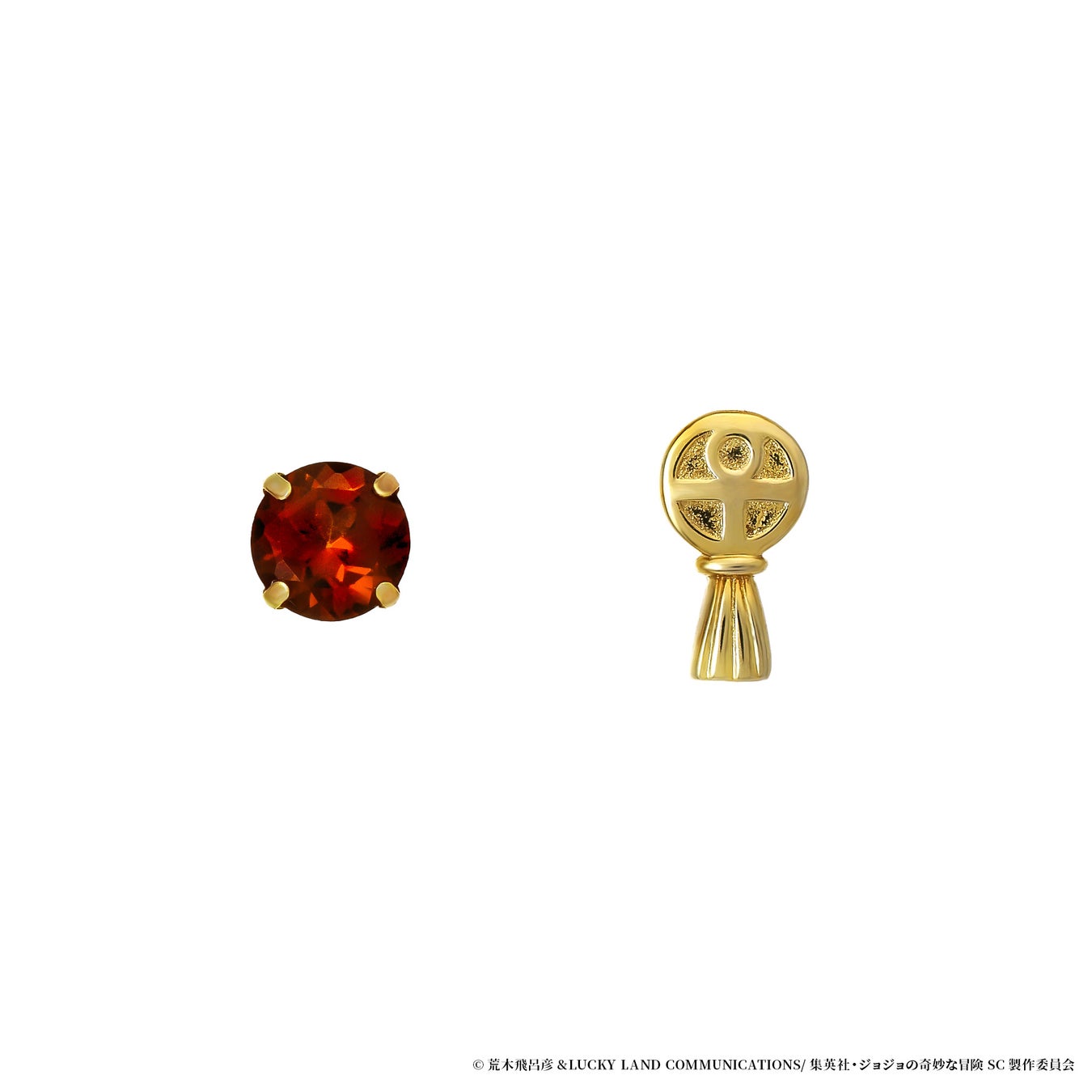 美しくきらめくラウンドカットを施した、燃えるような深紅のガーネットを使用。真っ赤な炎をまとって戦うマジシャンズレッドのイメージにぴったりのカラーです。アヴドゥルの首元に下がる装飾品をイメージした地金のピアスとセットです。