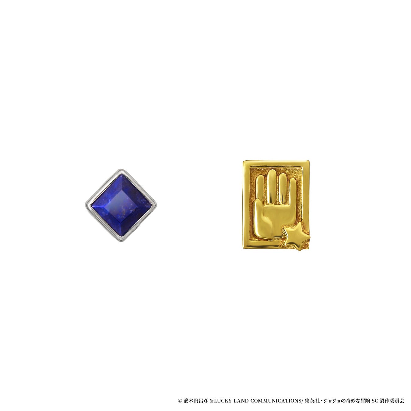 承太郎とスタープラチナをイメージした深いブルーのラピスラズリを使用。かっちりとしたフォルムで、学ランに身を包んだクールで男らしい承太郎を表現しています。承太郎の帽子に付いているバッジに星モチーフを添えた地金のピアスとセットです。