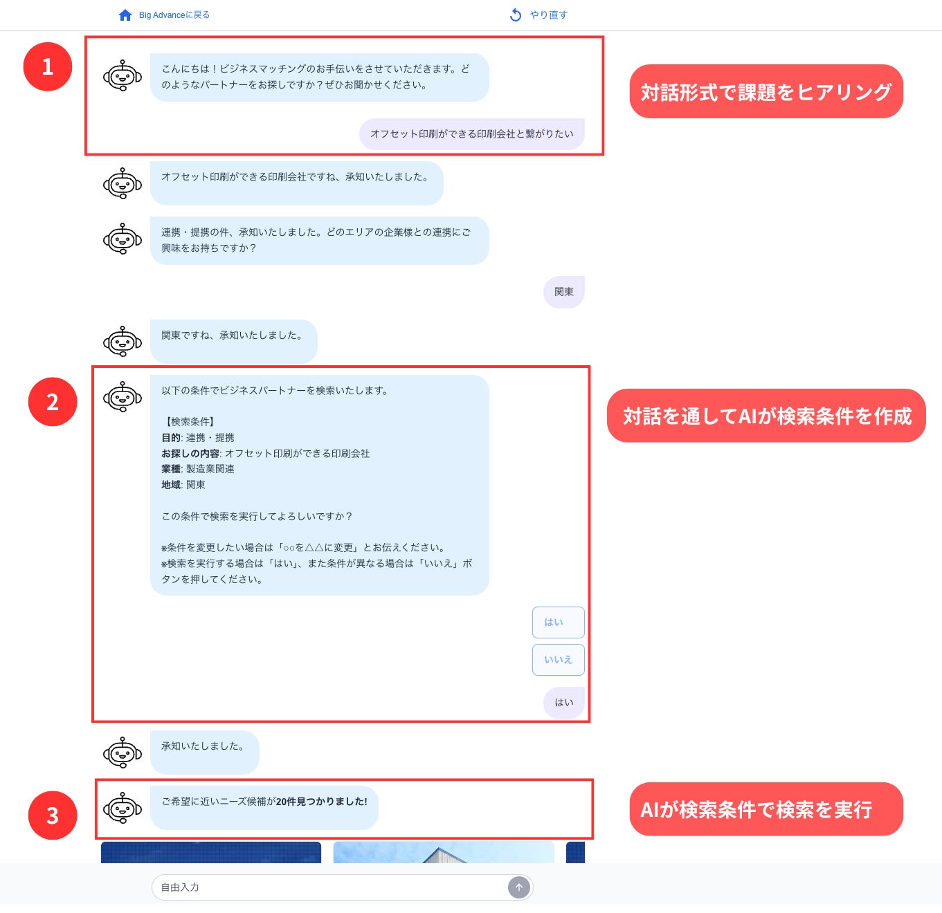 上記の課題を解決するため、当社は対話型AI検索機能を新たに開発しました。これにより、ユーザーはまるで人間に相談するように、自然な会話形式でビジネスニーズを入力できます。また、AIがその対話を通じて、ユーザーの曖昧な要望や潜在的なニーズを具体化し、全国約6万社のBig Advance会員の中から最適なパートナー候補を提案します。