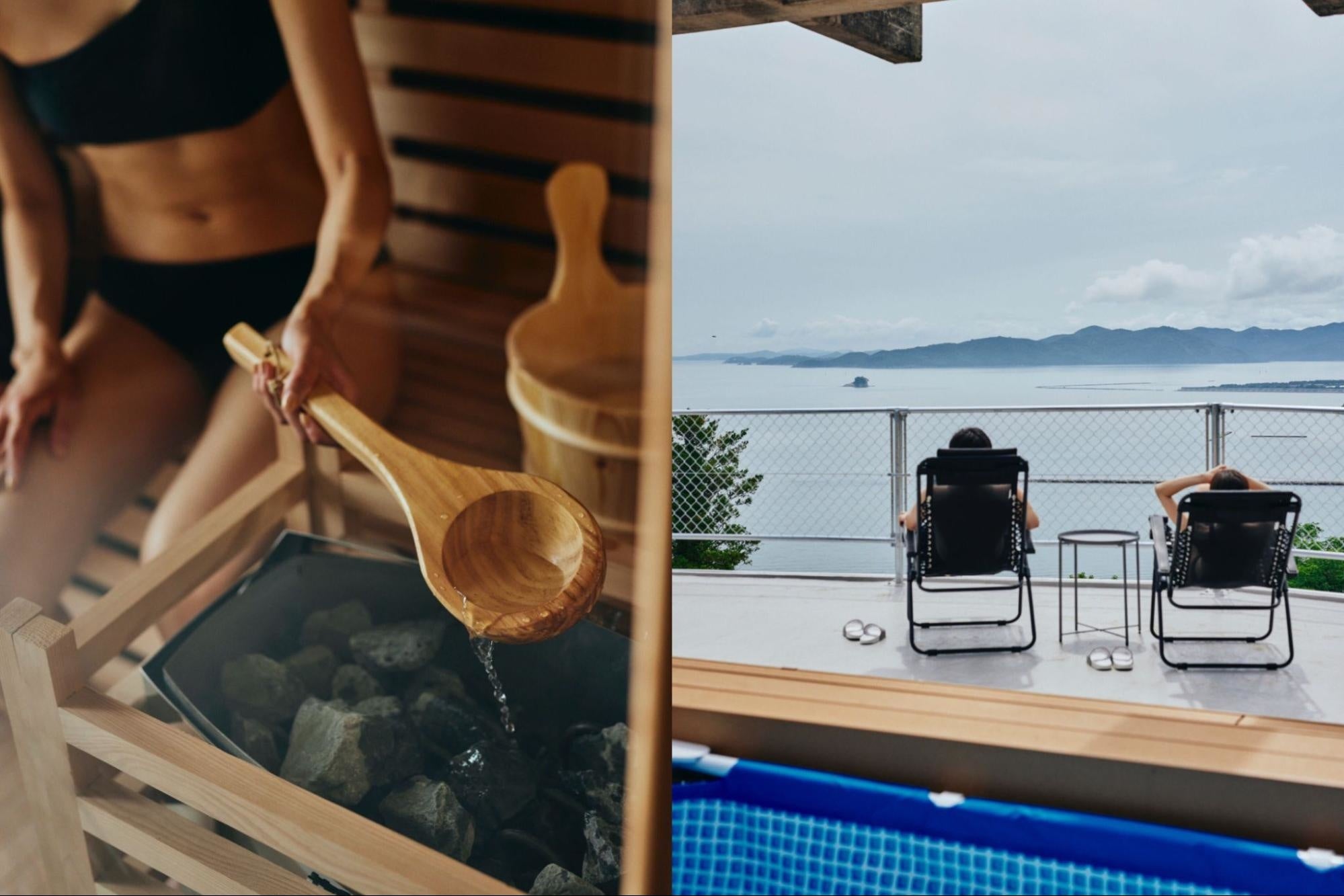 共用部には宿泊者様であればみなさまにご使用いただけるプライベートサウナを3台ご用意しております。サウナで思い切り汗を流した後は、瀬戸内海を一望しながらの水風呂、外気浴で身体を解放。日々の喧噪を忘れ、極上の「ととのい」を心ゆくまでお楽しみください。