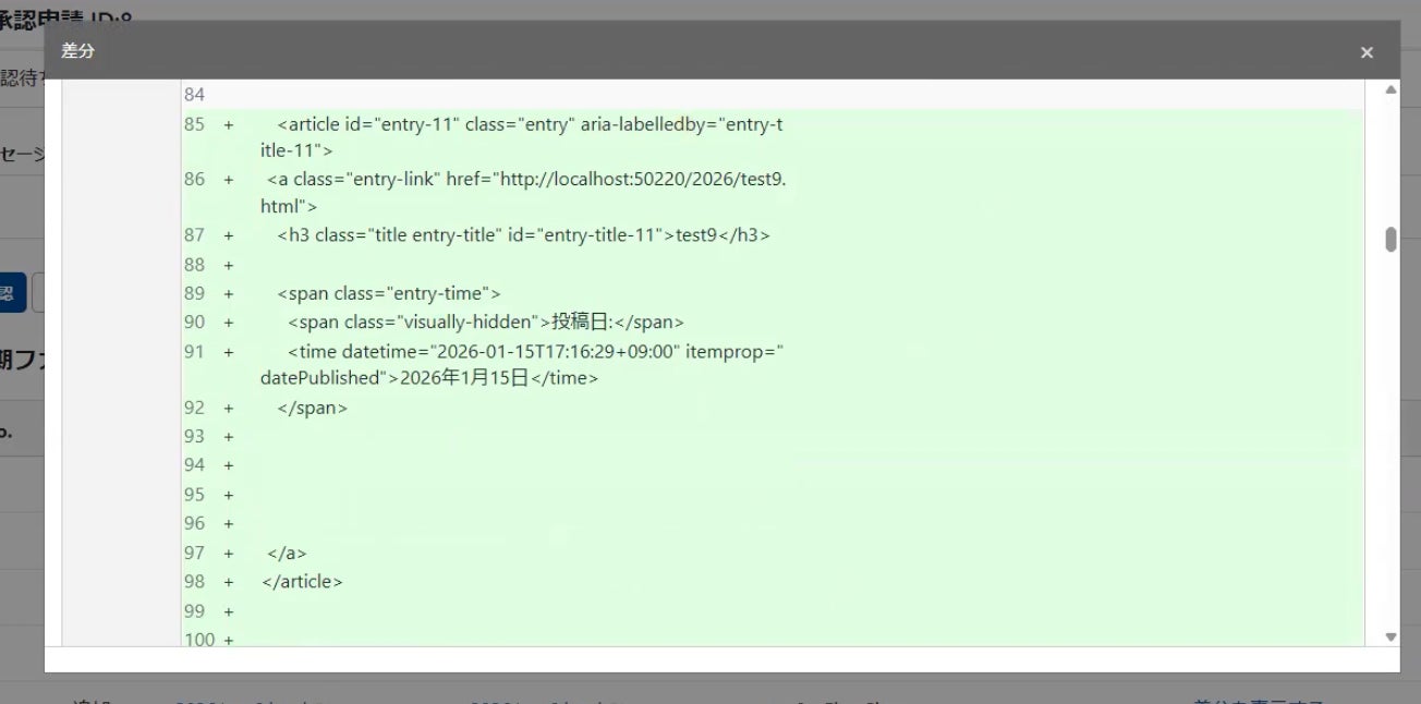 同期申請時に、同期対象ファイルの一覧と差分を表示。削除や変更を含む更新内容を事前に把握でき、より慎重なサイト更新運用が可能です。