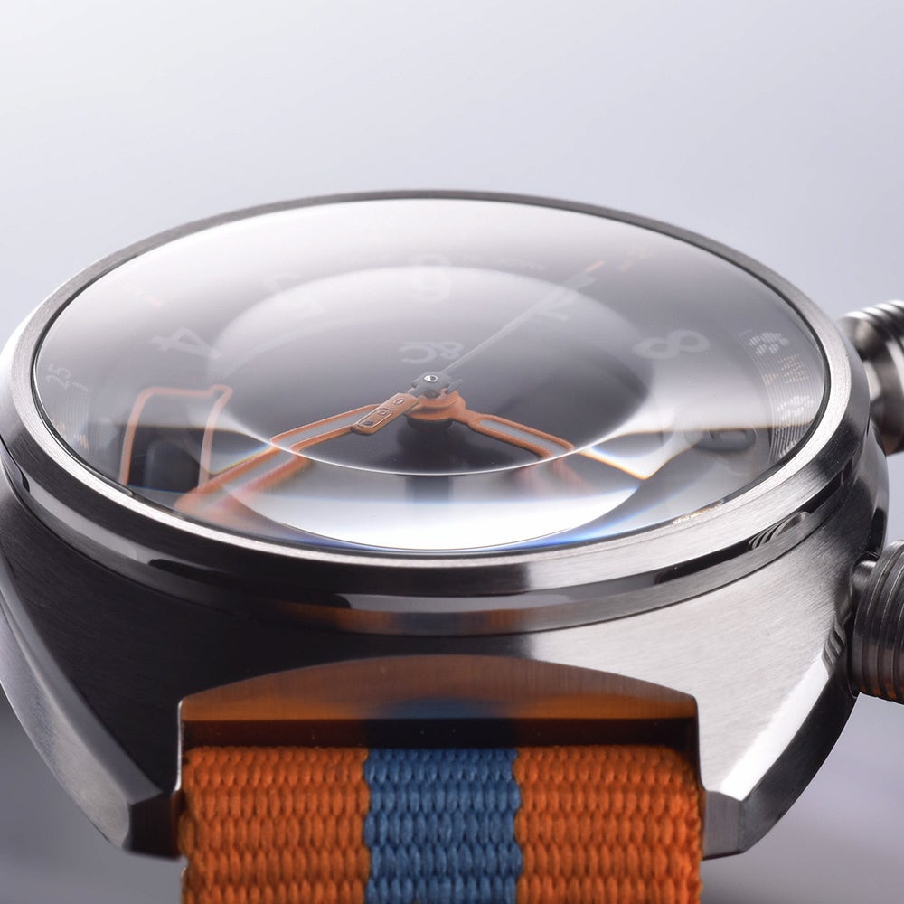 グラデーションダイヤルの文字盤にカメラのレンズを思わせるドームガラスを組み合わせることで、まるでカメラのレンズを覗き込むような奥行きを演出。